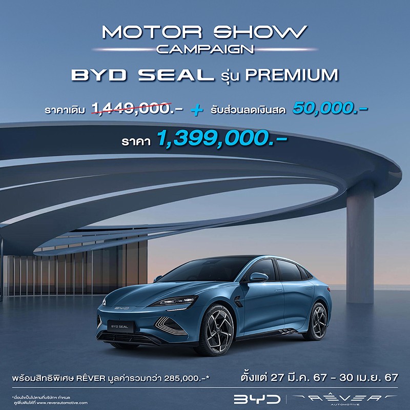 เรเว่ ออโตโมทีฟ จัดเต็มโปรโมชันต้อนรับงานมอเตอร์โชว์ สำหรับลูกค้าที่ซื้อ BYD SEAL ทุกรุ่น ตั้งแต่วันที่ 27 มีนาคม พ.ศ. 2567 – 30 เมษายน พ.ศ. 2567 (แคมเปญมีผลย้อนหลังเริ่มตั้งแต่วันที่ 1 มกราคม พ.ศ. 2567) โดยมีรายละเอียดดังนี้