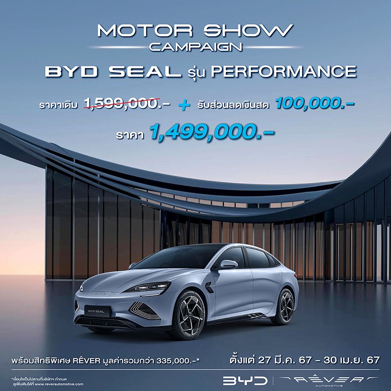 - ลูกค้าที่ซื้อ BYD SEAL รุ่น Performance รับส่วนลดเงินสด 100,000 บาท เหลือเพียง 1,499,000 บาท (จากราคาปกติ 1,599,000 บาท) พร้อมสิทธิพิเศษ RÊVER มูลค่ารวมกว่า 335,000 บาท