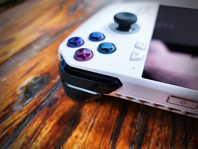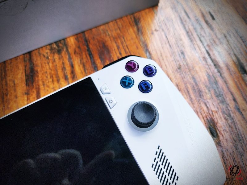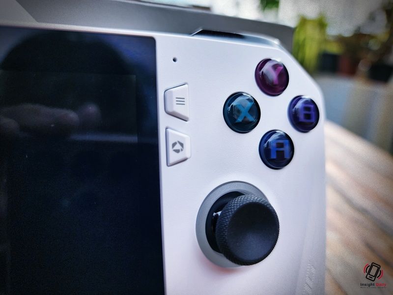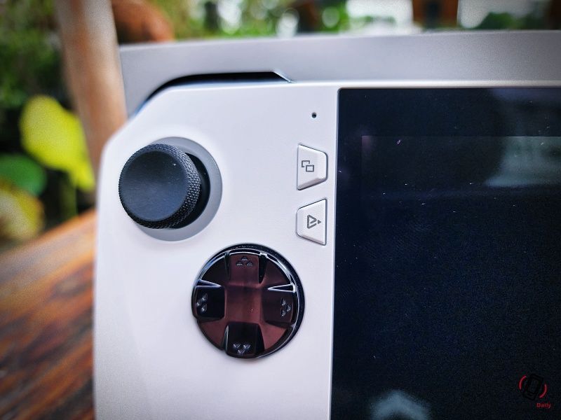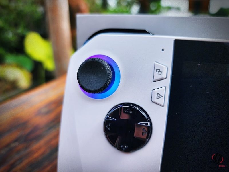 ขยับมาที่ด้านซ้ายของหน้าจอจะมีตัวคันโยกบังคับ Analog Sticks พร้อมวงแหวนไฟ RGB, ปุ่มกด D-Pad, ปุ่ม View button และปุ่มเมนู Armoury Crate button