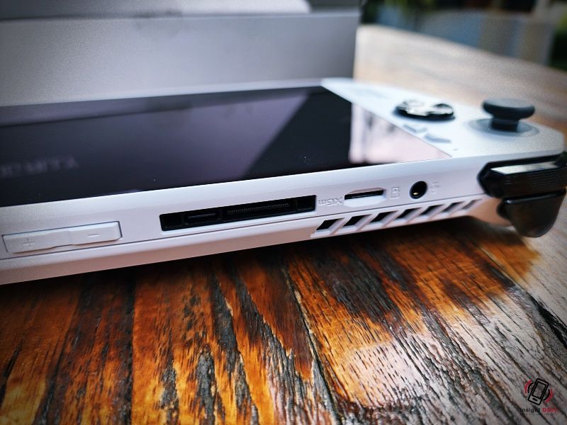 ที่ขอบตัวเครื่องด้านบนซ้าย มีปุ่ม L Trigger, รูเสียบชุดหูฟัง, ช่อง UHS-II microSD card reader (รองรับ SD, SDXC and SDHC), พอร์ต USB-C และ ROG XG Mobile Interface