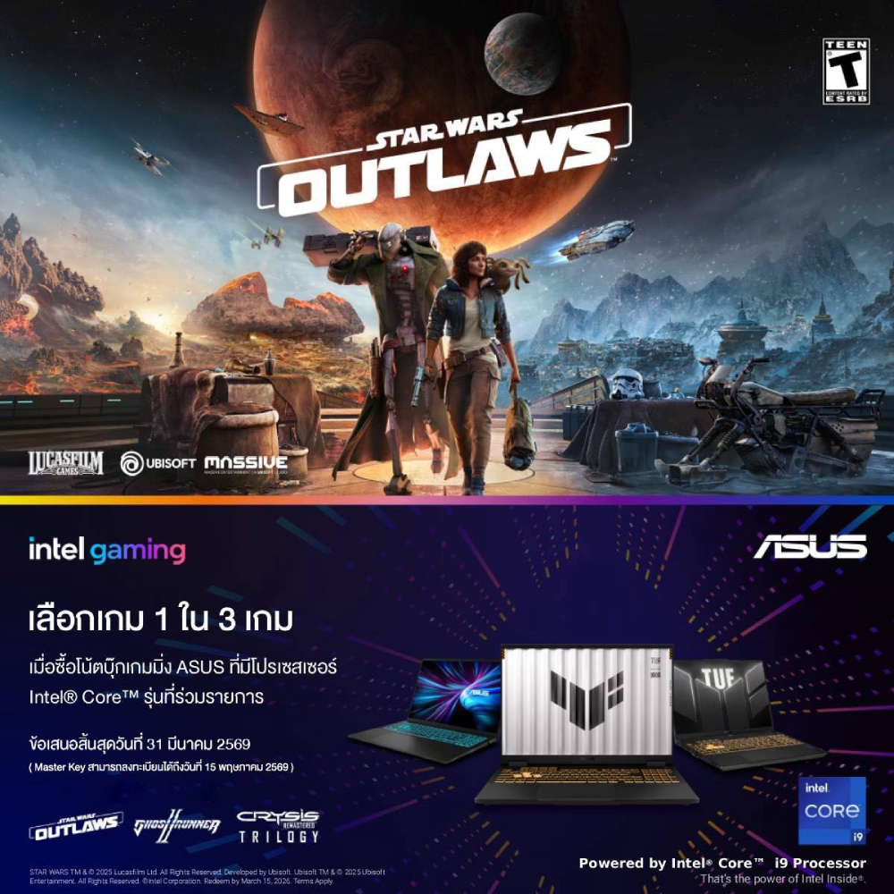 โปรโมชันพิเศษแถมเกมฟรี! ASUS ร่วมกับ Intel ขยายโปรโมชันเอาใจคอเกม เมื่อซื้อเกมมิ่งโน้ตบุ๊กซีรีส์ ASUS TUF Gaming (รุ่นที่ใช้ CPU Intel® Core™ i Gen 13 – 14) และ ASUS Gaming V16 (รุ่นที่ใช้ CPU Intel® Core™ 200 Series) ที่ร่วมรายการ สามารถเลือกรับเกม AAA ฟรี! 1 ใน 3 เกม ได้แก่ Star Wars Outlaw, Ghostrunner หรือ Crysis Remastered Trilogy และซื้อเฉพาะผ่านตัวแทนจำหน่ายชั้นนำ 4 แห่งทุกสาขา ได้แก่ Advice, Banana, IT CITY และ JIB
