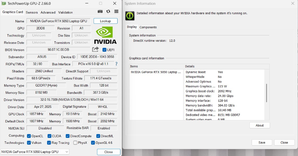 ไฮไลท์ที่สำคัญที่สุดของรุ่นนี้ คือการเป็นเกมมิ่งโน้ตบุ๊กรุ่นแรก ๆ ที่ได้ใช้การ์ดจอ NVIDIA® GeForce RTX™ 5050 (โค้ดเนม Blackwell) ที่มาพร้อม VRAM ขนาด 8GB GDDR7 และค่า TGP (Total Graphics Power) ที่สูงถึง 115W ซึ่งถือว่าสูงที่สุดสำหรับ GPU รุ่นนี้ จากการทดสอบ บอกได้เลยว่าประสิทธิภาพของมันไม่ใช่เรื่องเล่นๆ ครับ
