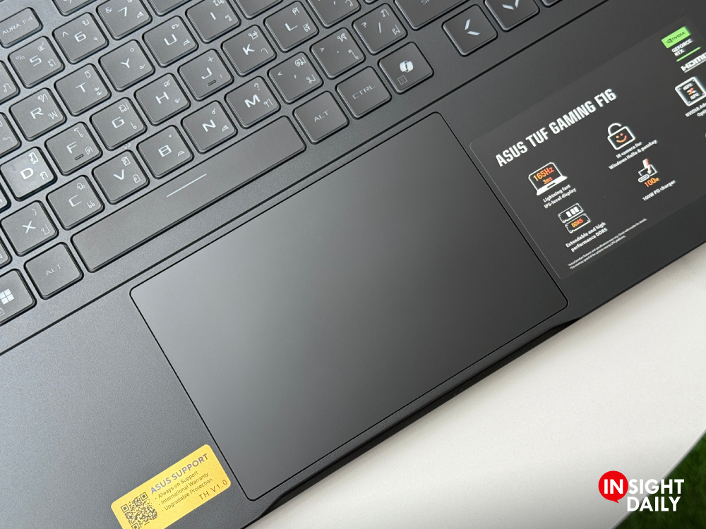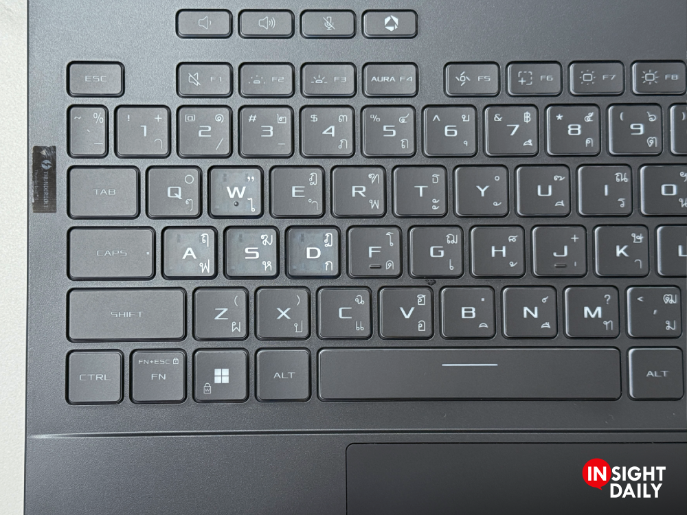 ในขณะที่คีย์บอร์ดเป็น Full-size พร้อมไฟ RGB แบบ One Zone มีปุ่ม Copilot Key สำหรับเรียกใช้ AI ของ Windows 11 และเทคโนโลยี Overstroke ที่ช่วยให้การตอบสนองรวดเร็ว ทนทานต่อการกดกว่า 20 ล้านครั้ง และมีการใส่ลูกเล่นไว้ที่ปุ่ม “A W S D” ให้เป็นปุ่มแบบใส ให้รู้สึกถึงกลิ่นอายของความเป็น Gaming หน่อย ๆ ส่วนตัวทัชแพดมีขนาดที่กว้างสามารถใช้งานได้สะดวก