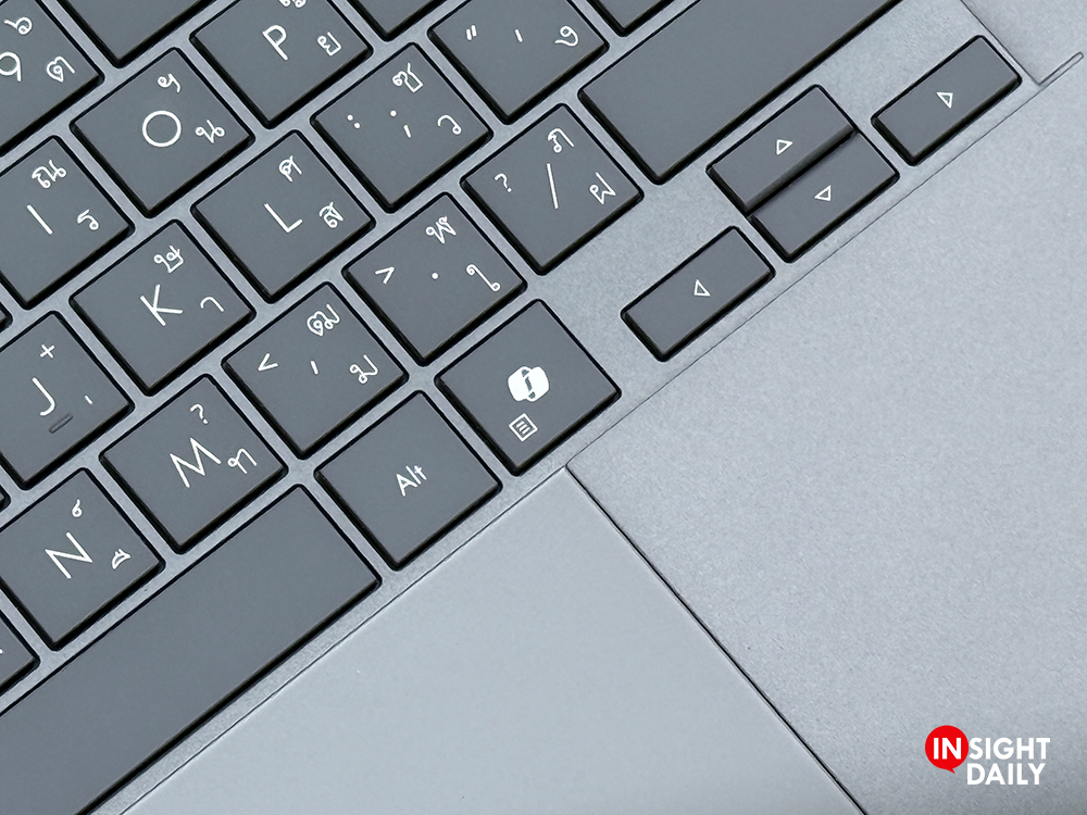ถัดลงมาก็จะเป็นตำแหน่งของแผงคีย์บอร์ดที่มีปุ่มแป้นพิมพ์ที่ไม่ทิ้งรอยใดๆ พร้อมโทนสีสง่างาม และมีทัชแพดที่มีขนาดใหญ่ ง่ายต่อการใช้งาน