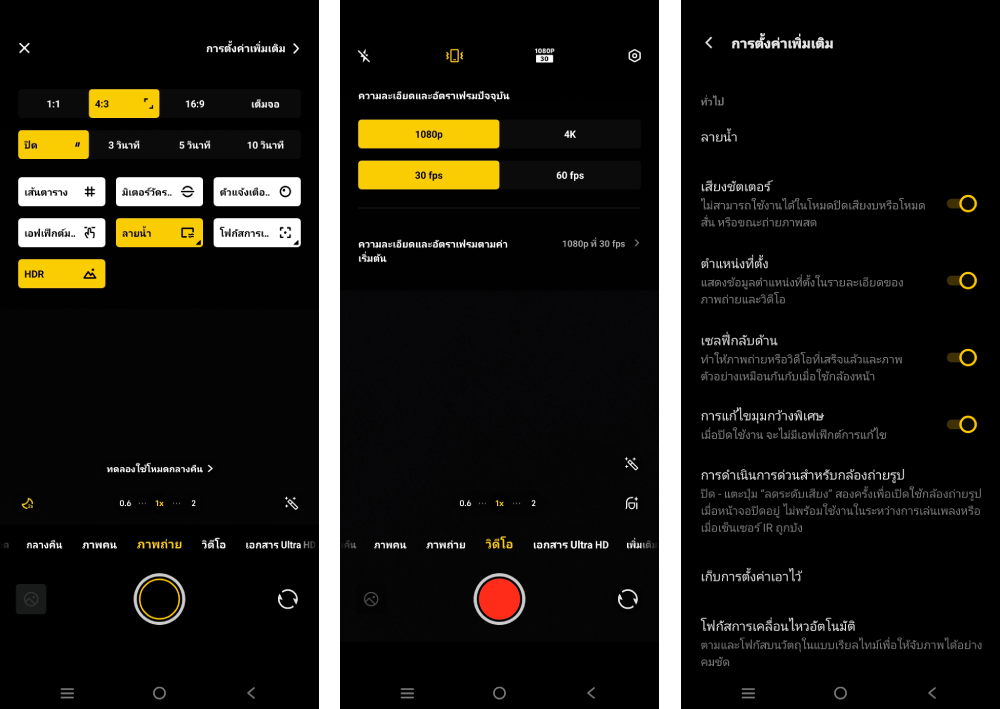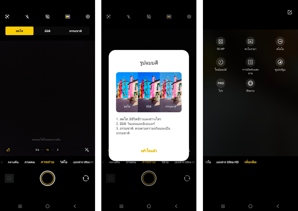 — โหมดถ่ายภาพ : Snapshot, Night, Portrait, Photo, Video, Ultra HD Documents, 50 MP, Pano, Slo-mo, Time-lapse, Long Exposure, Supermoon, Pro, Professional Video