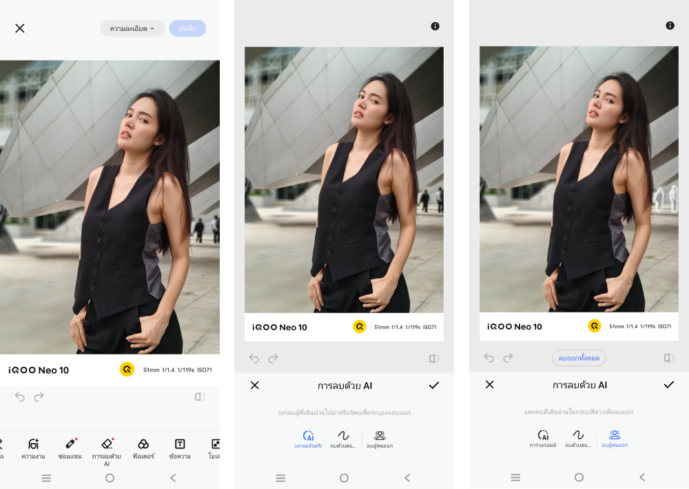 นอกจากนี้ทาง iQOO ยังใส่ฟีเจอร์ AI สำหรับปรับแต่งภาพถ่ายหลังถ่ายมาให้ด้วยกัน 2 ฟีเจอร์  คือ