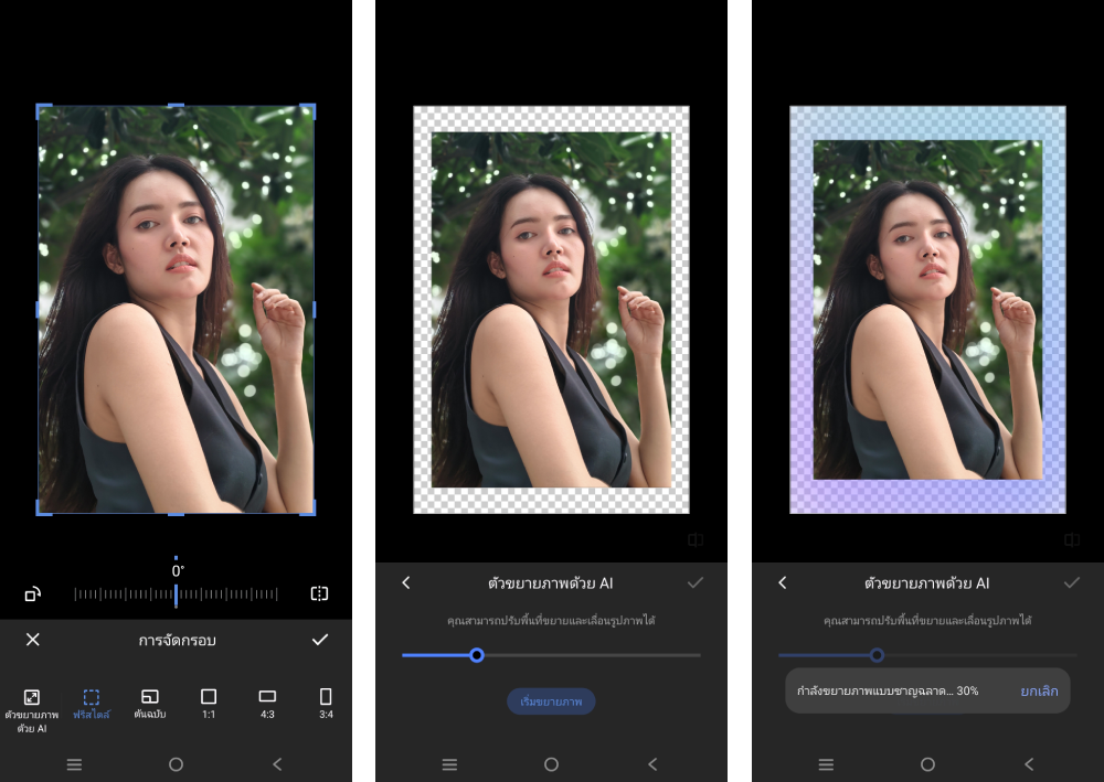 วิธีเปิด : อัลบั้ม > แก้ไข > การจัดกรอบ > ตัวขยายภาพด้วย AI