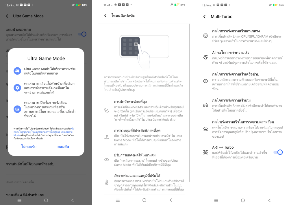 • AI ถนอมสายตาในเกม ช่วยกรองแสงสีฟ้าตามเนื้อหาเกมที่เล่นอยู่ (เปิดใช้ใน Ultra Game Mode)