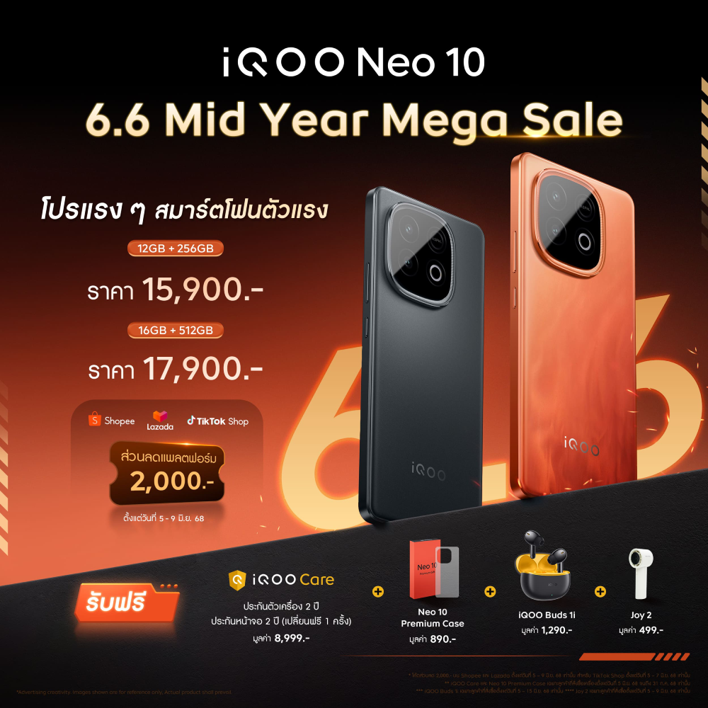 *ประกัน iQOO Care และ Neo 10 Premium Case จะได้รับเฉพาะผู้ที่สั่งซื้อตั้งแต่วันที่ 5 มิถุนายน – 31 กรกฎาคม 2568 เท่านั้น