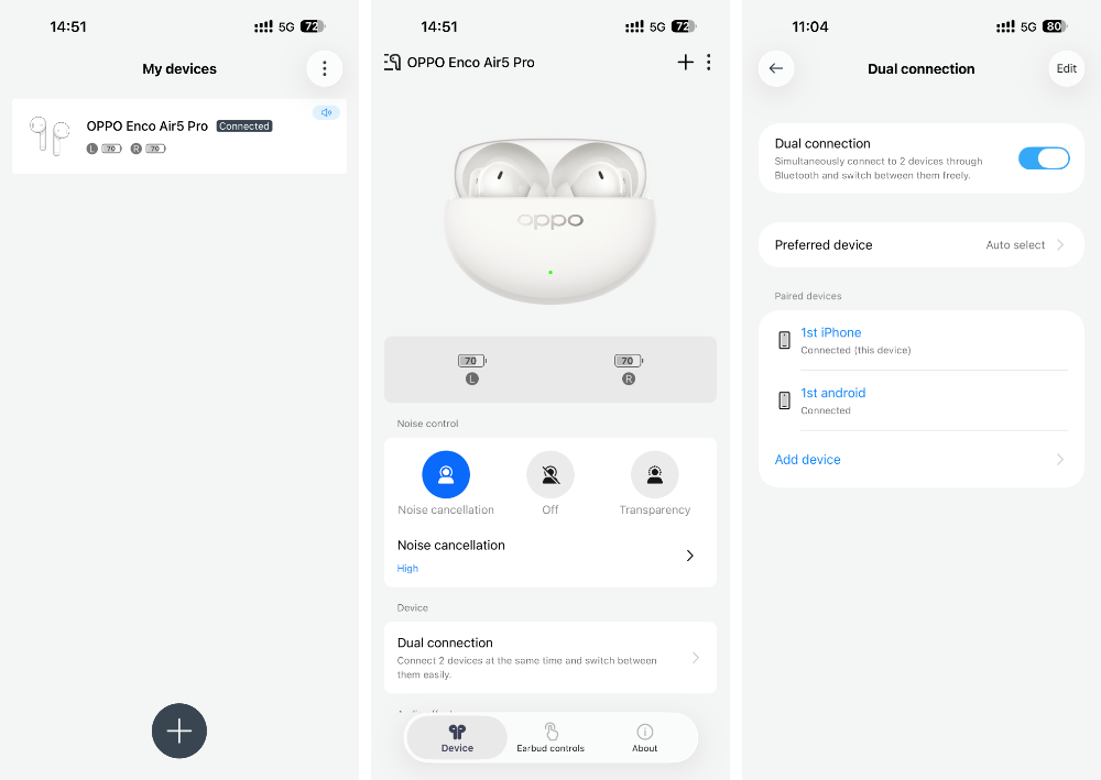 OPPO Enco Air5 Pro เป็นหูฟังไร้สายที่รองรับการใช้งานร่วมกับระบบปฏิบัติการ Android และ iOS ผ่านการเชื่อมต่อ Bluetooth โดยตรง หรือการเชื่อมต่อผ่านแอปพลิเคชั่น “HeyMelody” ของ OPPO ครับ ซึ่งผมแนะนำให้เชื่อมต่อผ่านตัวแอปฯ เมื่อต้องใช้งาน เพราะจะสามารถเลือกปรับแต่งค่าการใช้งานของหูฟังได้ทั้งหมด ตรงตามที่เราต้องการได้เลย