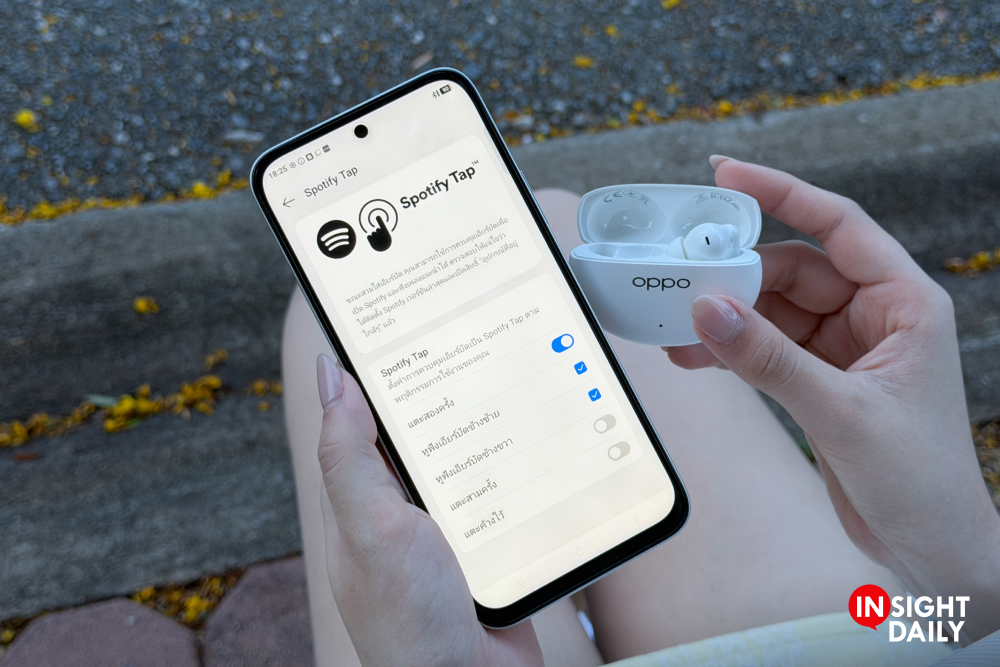 นอกจากนี้ OPPO Enco Air5 Pro ยังสามารถสั่งการตัวหูฟังด้วยการแตะสัมผัสที่บริเวณก้านด้านบนของหูฟังได้ทันที เช่น เพิ่ม-ลดเสียง, รับสายเรียกเข้า, เล่นหรือหยุดเพลง, เปลี่ยนเพลงถัดไป หรือเปิด-ปิดโหมด ANC เป็นต้นไป โดยรูปแบบการสั่งการตัวหูฟังทั้งหมด เราสามารถเข้าไปปรับแก้ไขการสั่งการใหม่เพิ่มเติมได้ภายในแอปฯ และที่เป็นไฮไลต์เด็ดเลย คือ มีฟีเจอร์ Spotify Tap เป็นหนึ่งในคำสั่งการแตะสั่งการหูฟังด้วย ซึ่งเราจะสามารถเข้าถึงเพลย์ลิสต์ส่วนตัวบน Spotify ของเราพร้อมเล่นเพลงแรกได้ทันที เพียงแค่แตะเท่านั้น ซึ่งเราสามารถเข้าไปตั้งค่ารูปแบบการแตะสั่งการได้จากแอปฯ