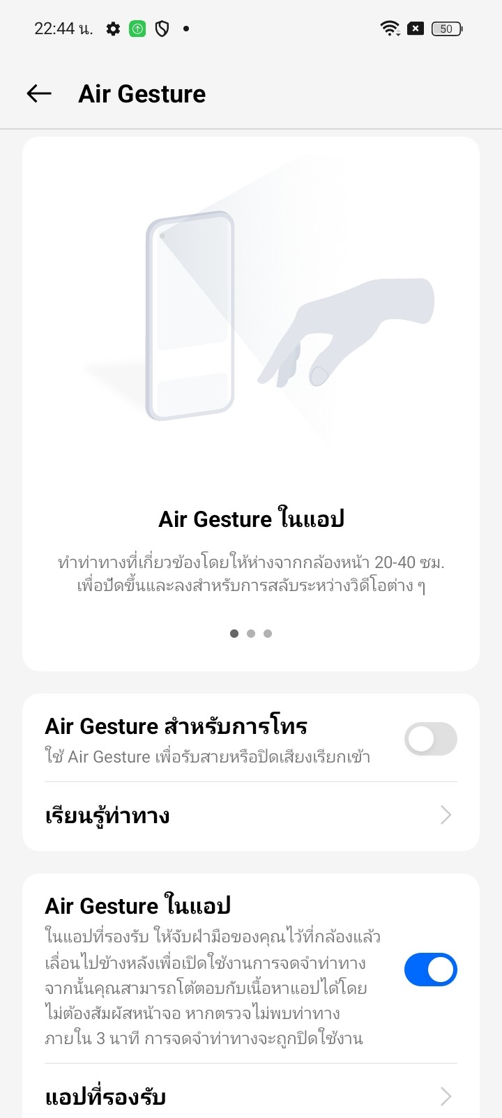 การเข้าไปปรับแต่งเมนู : การตั้งค่า > ฟีเจอร์พิเศษ > การตรวจจับอัจฉริยะ > Air Gesture