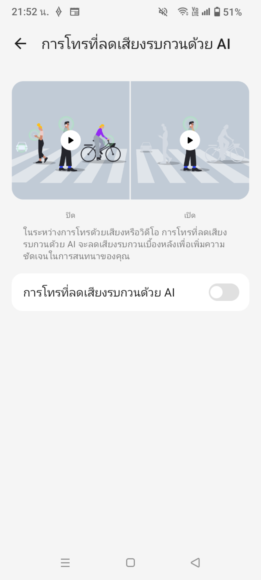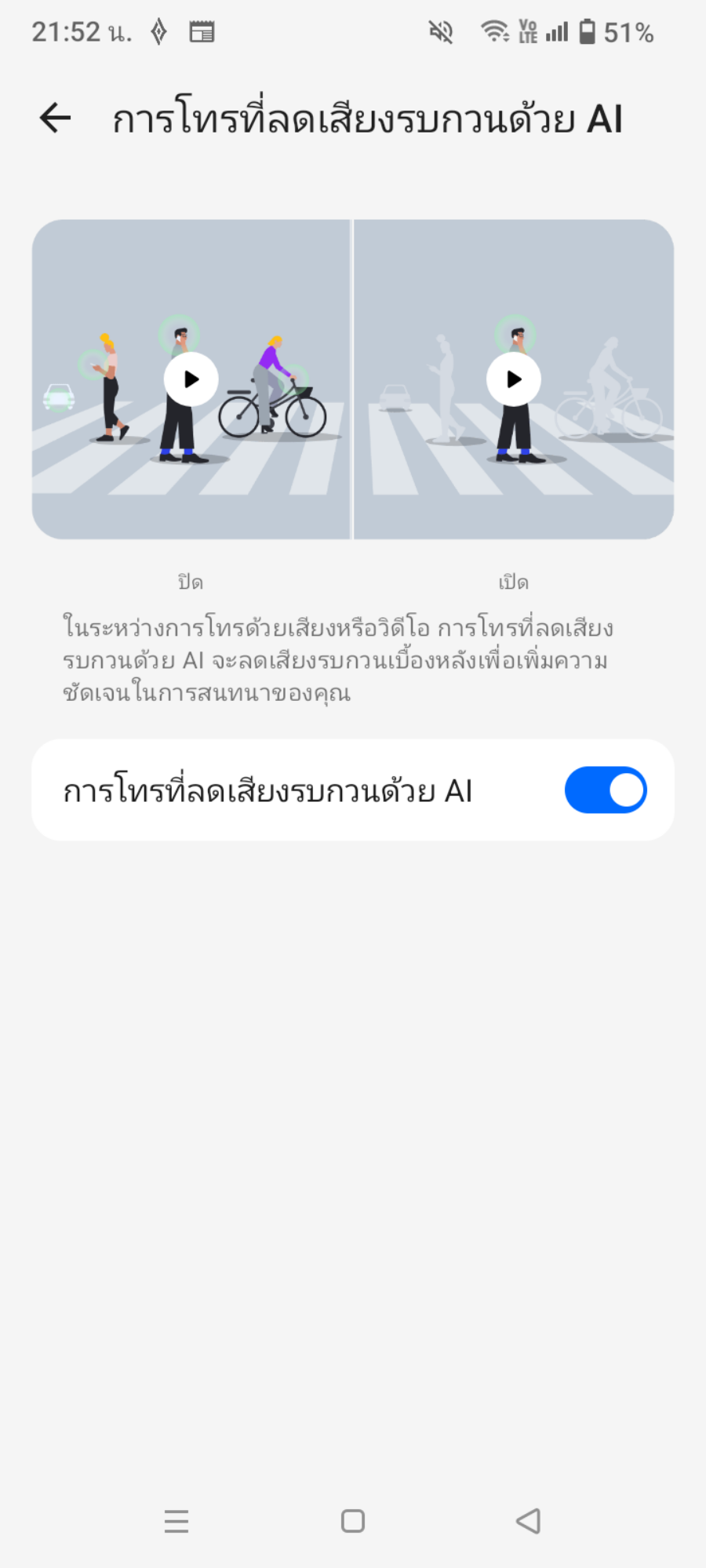 AI Noise reduce คุณสมบัติในการลดเสียงรบกวนด้วยการนำ AI มาใช้วิเคราะห์และจัดการเสียงรบกวนเบื้องหลังของเราระหว่างการโทร ช่วยมอบประสบการณ์การสื่อสารที่ชัดเจนขึ้นจากสมาร์ตโฟนทั่วไปที่ไม่มี แนะนำให้เปิดถ้าหากต้องสนทนาสายนอกสถานที่บ่อย ช่วยให้เราได้ยินเสียงปลายสายชัดขึ้น