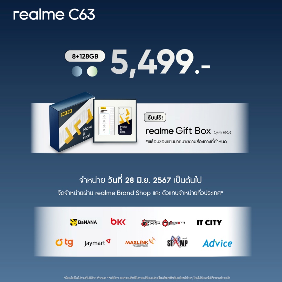 เมื่อซื้อ realme C63 (8+128GB) ราคา 5,499 บาท รับฟรี!* realme Gift Box มูลค่า 890 บาท เริ่มจำหน่ายวันที่ 28 มิ.ย. 2567 เป็นต้นไป ผ่าน realme Brand Shop และตัวแทนจำหน่ายทั่วประเทศ* และสามารถซื้อ realme C63 (8+128GB) ในราคาพร้อมแพคเกจมือถือผ่านผู้ให้บริการเครือข่าย AIS, TRUE และ dtac ในราคาเริ่มต้นต่ำสุดเพียง 2,799 บาท พร้อมรับฟรี! *realme Gift Box มูลค่า 890 บาท