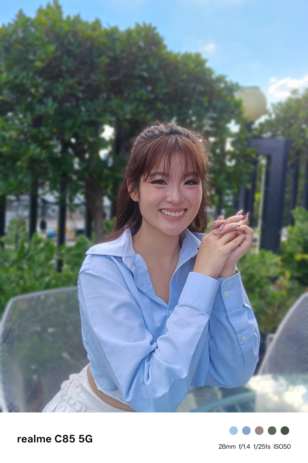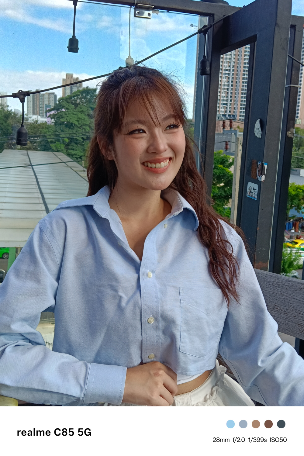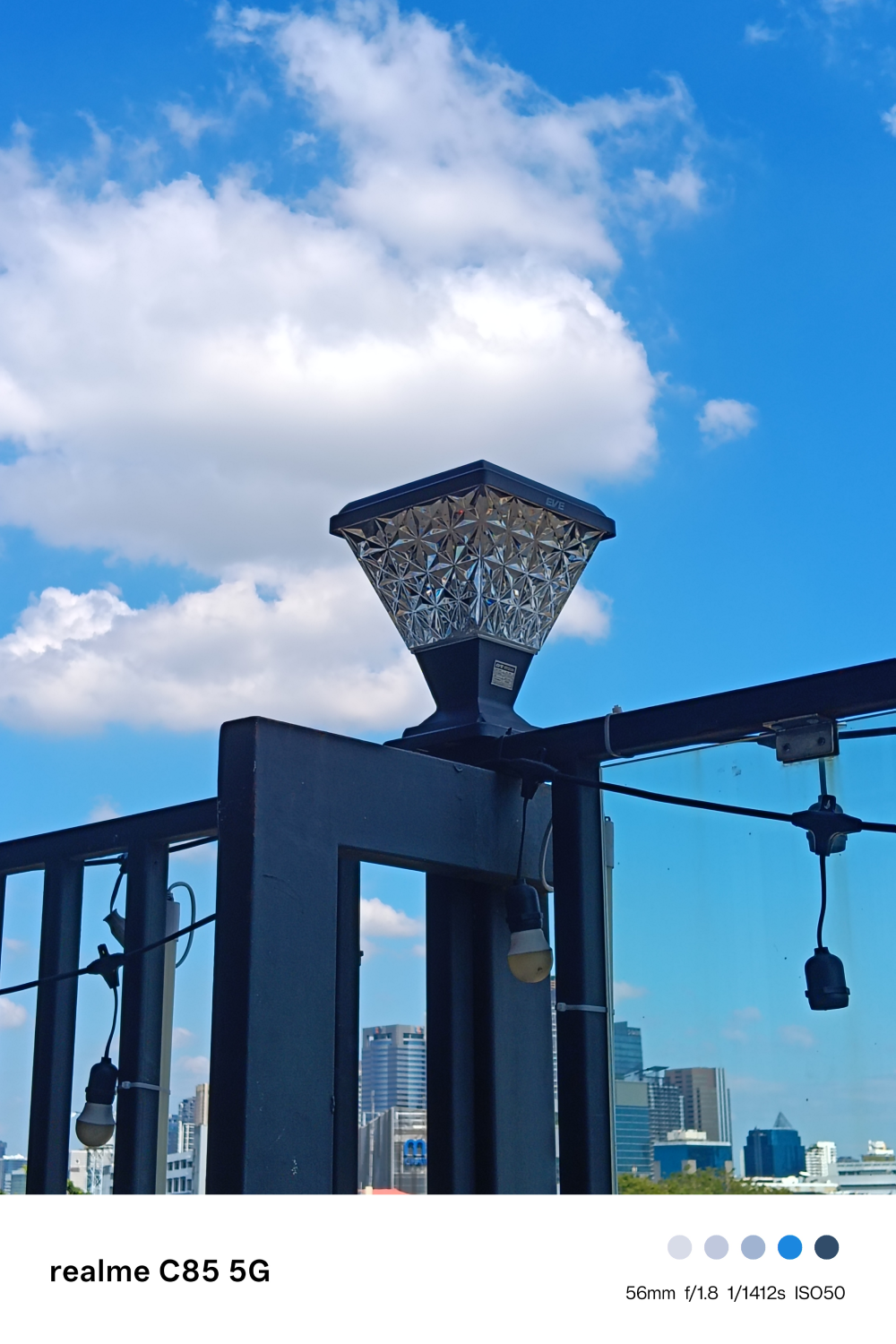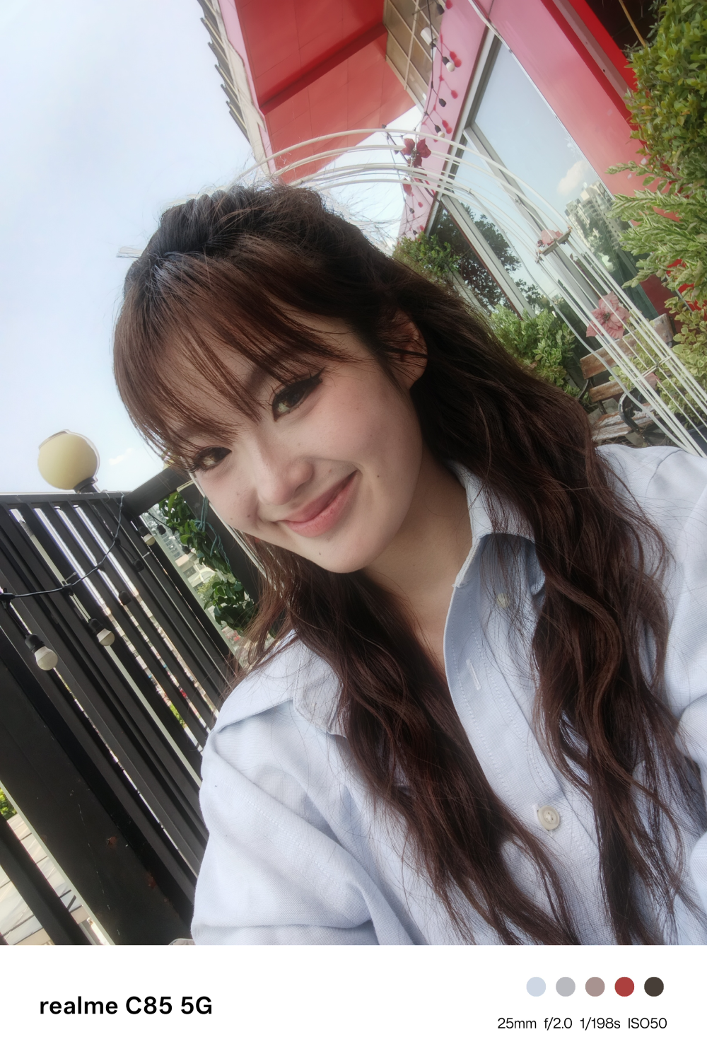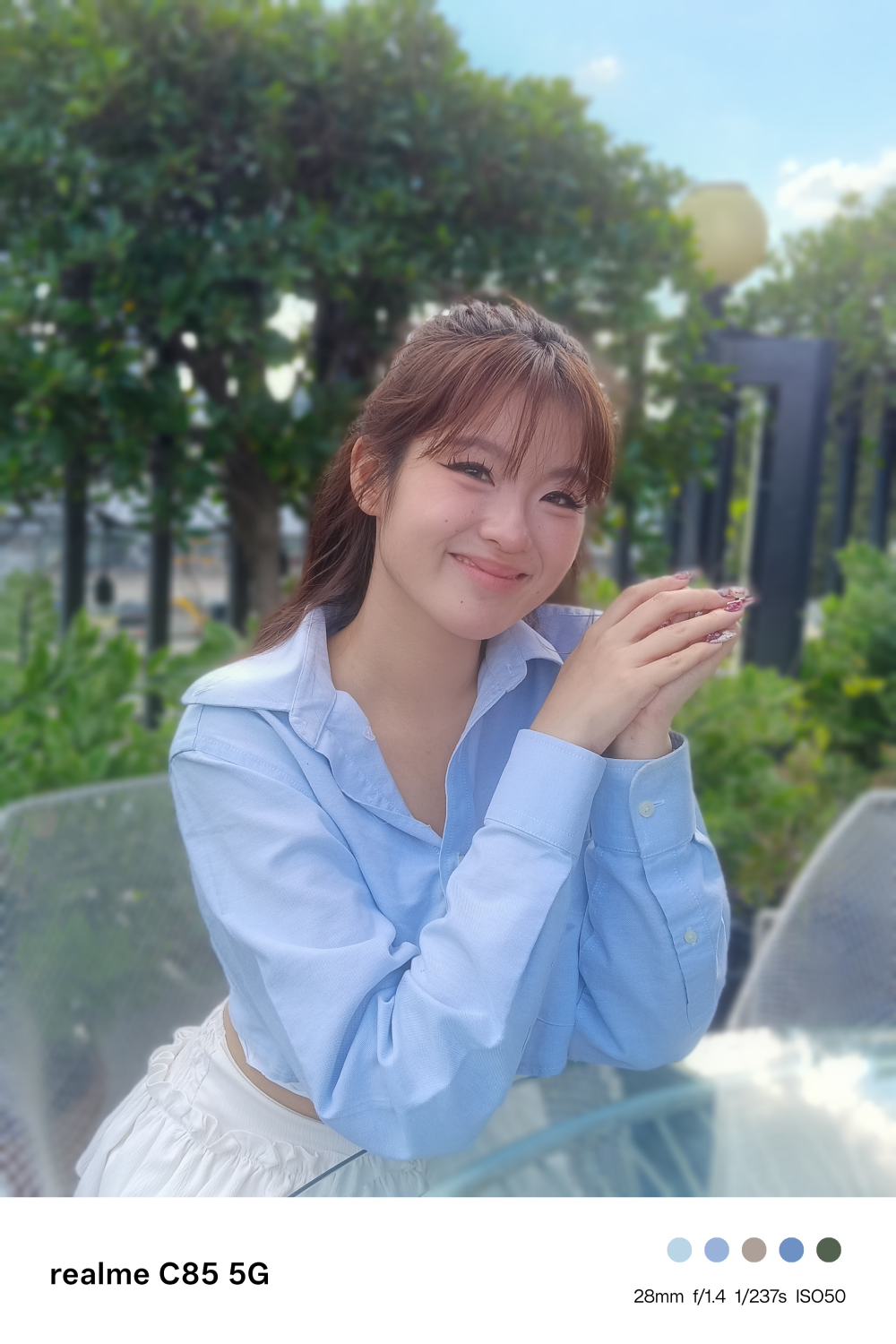 realme C85 5G มาพร้อมกล้องหลัง 50MP SONY AI Main Camera ใช้เซนเซอร์ Sony IMX852 ความละเอียด 50MP (f/1.8) พร้อมกล้องหน้า 8MP AI Camera ความละเอียด 8MP (f/2.0) มาพร้อมโหมดถ่ายภาพให้เลือกใช้งานกำลังพอดี ไม่มาก ไม่น้อย ที่สำคัญคือถ่ายสนุก ผลงานที่ได้อาจจะไม่หวือหวา ด้วยความที่ลูกเล่นไม่มาก แต่ก็สวยดีเลยทีเดียว