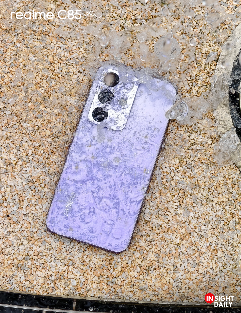 โดย realme C85 5G พร้อมพลังกันน้ำสุดล้ำระดับ IP69 Pro สามารถทนน้ำใต้น้ำได้ถึง 60 วัน, ดำน้ำลึก 6 เมตร และทนของเหลวได้ 36 ชนิด