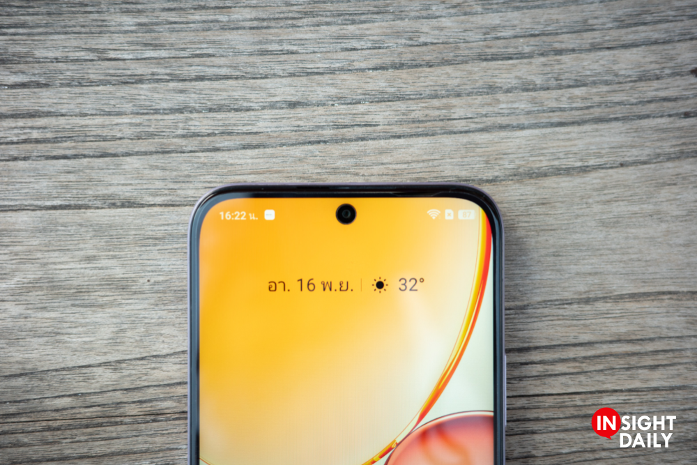 ด้านหน้าตัวเครื่อง วางกล้องหน้าแบบเจาะรูตรงกลาง 8MP AI Camera และเหนือขึ้นไปบริเวณขอบจอเป็นลำโพงเสียงสนทนา