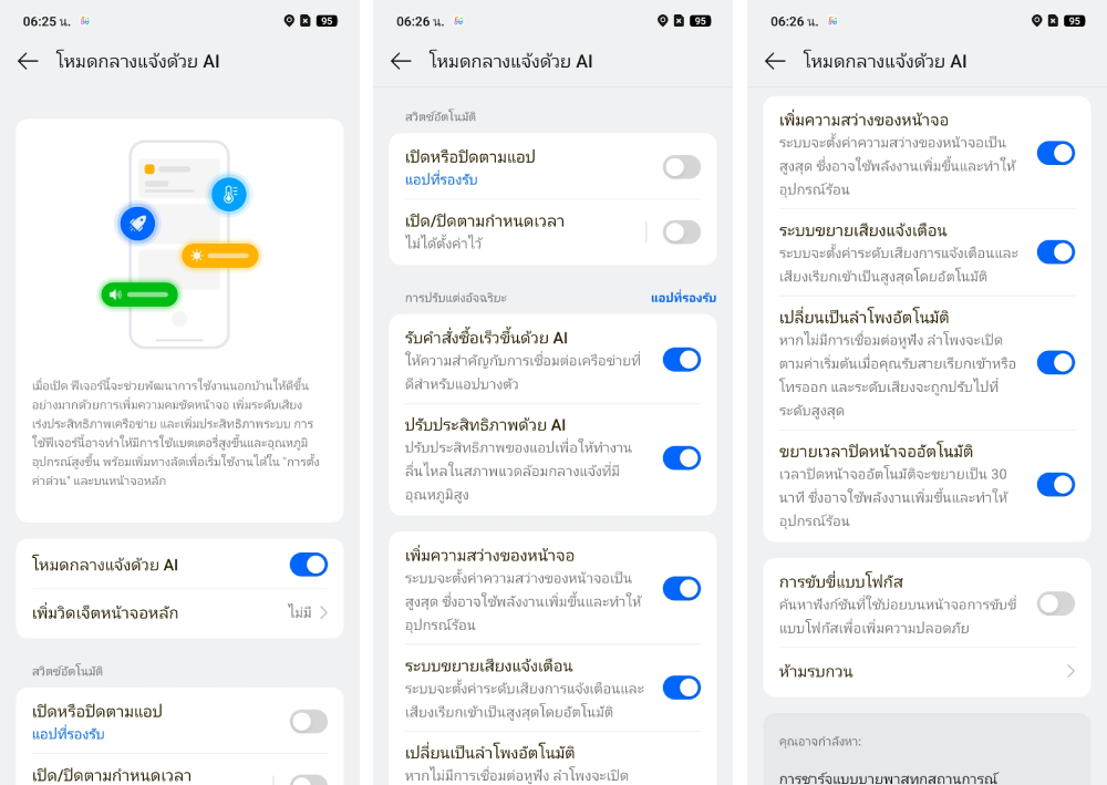 realme C85 5G เรียกได้ว่าเป็น Outdoor AI Partner คู่หูสมาร์ตโฟนที่ได้รับการปรับแต่งมาเป็นพิเศษสำหรับการใช้งานกลางแจ้ง ซึ่งนอกจากหน้าจอแบบ Ultra Bright แล้ว ยังมี “AI Outdoor Mode” (โหมดกลางแจ้งด้วย AI) โหมดพิเศษที่เมื่อเปิดใช้งาน จะเพิ่มความคมชัดหน้าจอ เพิ่มระดับเสียง เร่งประสิทธิภาพเครือข่าย และเพิ่มประสิทธิภาพระบบ เพื่อให้การใช้งานสมาร์ตโฟนนอกบ้านให้ดียิ่งขึ้น