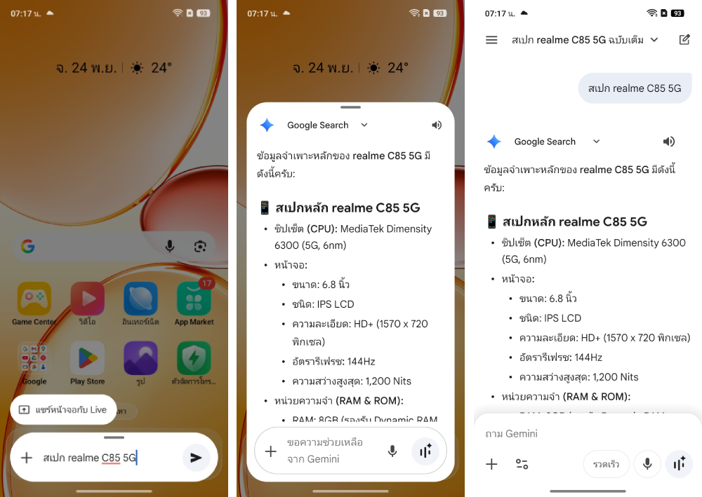 หรือจะเป็น “Circle to Search” วงกลมเพื่อค้นหาผลลัพธ์ที่ต้องการได้อย่างรวดเร็ว รวมไปถึง “Google Gemini” ผู้ช่วย AI ที่จะให้ความช่วยเหลือในการเขียน วางแผน ระดมความคิด ตอบคำถามต่าง ๆ และอีกมากมาย