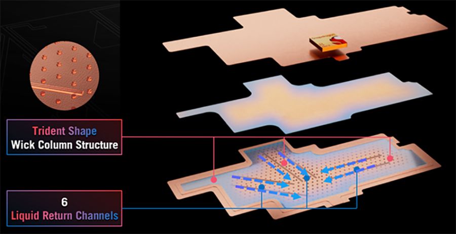 จึงทำให้สามารถการกระจายความร้อนมายัง ROG Rapid-Cycle Vapor Chamber ที่เป็นโครงสร้างเสากั้นละหว่างกลางของแผ่น Vapor Chamber (Trident Shape Wick Column Structure) รูปทรงตัว Y และยังมี Liquid Return Channels เพื่อเพิ่มพื้นที่การไหลและควบคุมการไหลของของเหลวภายใน Vapor Chamber ให้กลับมาอยู่ในตำแหน่งที่เหมาะสมในการระบายความร้อนให้ได้ประสิทธิภาพสูงสุด