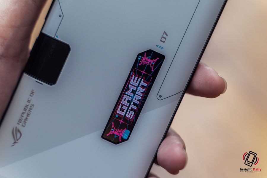นอกจากสีและลวดลายที่ดูมีหนึ่งเดียวของ ASUS แล้ว สำหรับรุ่น Ultimate จะมีหน้าจอแสดงผลที่สอง ที่มีชื่อเรียกว่า “ROG Vision” ติดตั้งมาที่ด้านหลังด้วย ซึ่งจอตัวนี้เป็นจอ OLED ขนาด 2 นิ้ว รองรับการแสดงผลอนิเมชั่น 6 รูปแบบตามการใช้งาน