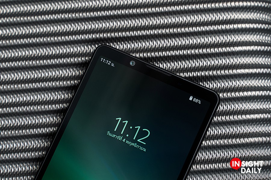 เหนือหน้าจอขึ้นไปเป็นตำแหน่งของกล้องหน้าความละเอียด 12MP (F2.0) และลำโพงสเตอริโอคู่ที่ติดตั้งมาบริเวณขอบหน้าจอบน-ล่าง