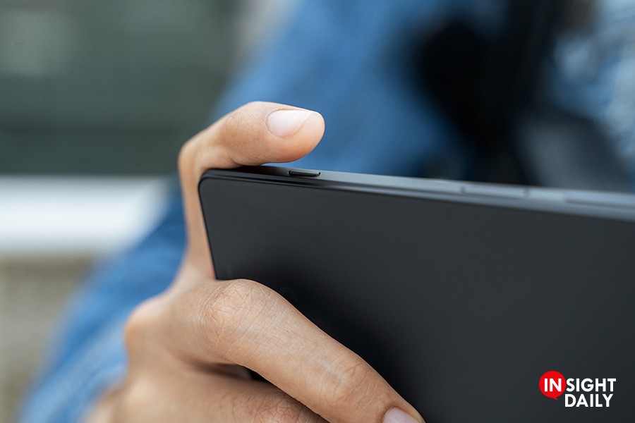 ด้านขวาตัวเครื่อง มีปุ่มกดปรับระดับเสียง (Volume), ปุ่มเปิด-ปิดตัวเครื่อง, แป้นสแกนลายนิ้วมือ และปุ่มชัตเตอร์กล้องถ่ายรูป