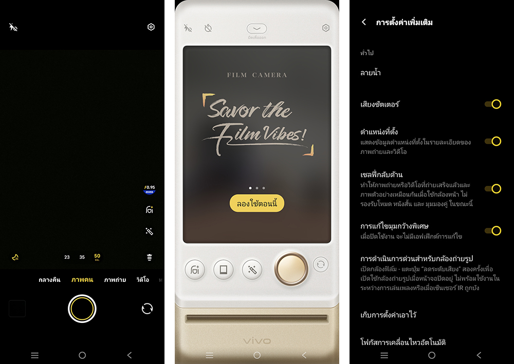 ทาง vivo ออกแบบมาให้เราได้ประสบการณ์การถ่ายภาพเหมือนใช้กล้องฟิล์มจริง ๆ เลยล่ะ ใครที่ชอบใช้กล้องฟิล์มมาก่อนจะชอบแน่นอน โดยเราสามารถเข้าใช้งานโหมดกล้องฟิล์มได้ด้วยการปัดจอขึ้นจากด้านล่างของหน้าจอบริเวณใต้ปุ่มชัตเตอร์กล้องถ่ายรูป ขณะที่อยู่ในหน้าเมนูกล้องถ่ายรูป