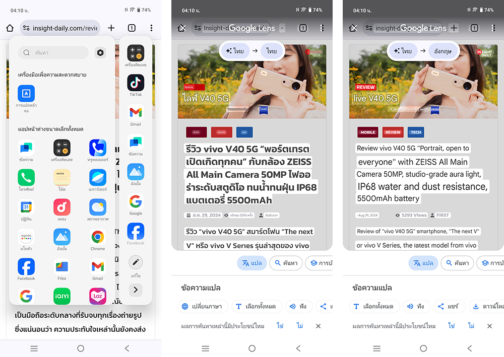 เป็นการใช้ AI แปลข้อความบนหน้าจอทั้งหมดที่กำลังเปิดใช้งานอยู่ ไม่ว่าจะเป็น หน้าเว็บไซต์, บทความ หรือเนื้อหาต่าง ๆ โดยไม่ต้องออกจากหน้าจอหรือแอปฯ ที่ใช้งาน ซึ่งสามารถเรียกใช้งานฟีเจอร์นี้ได้ 2 วิธี