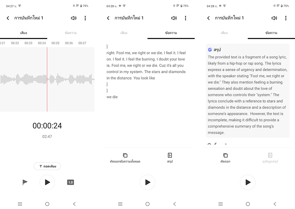 การเรียกใช้งาน : ไปยังไฟล์เสียงบันทึก > เลือก “ถอดเสียง” > เลือก “สรุป” > ดูข้อมูลสรุป