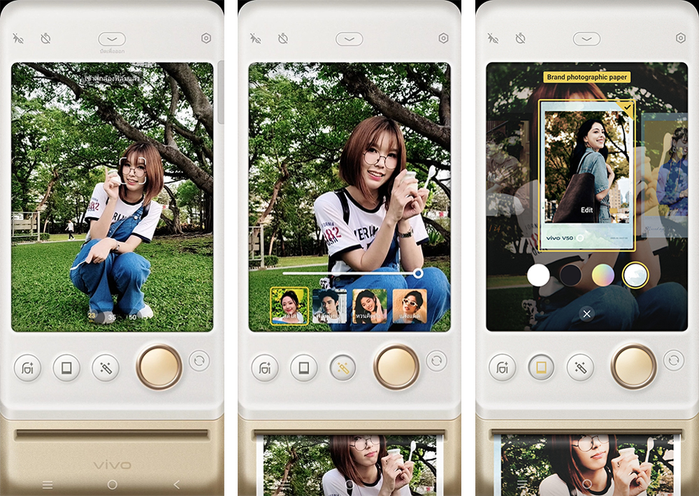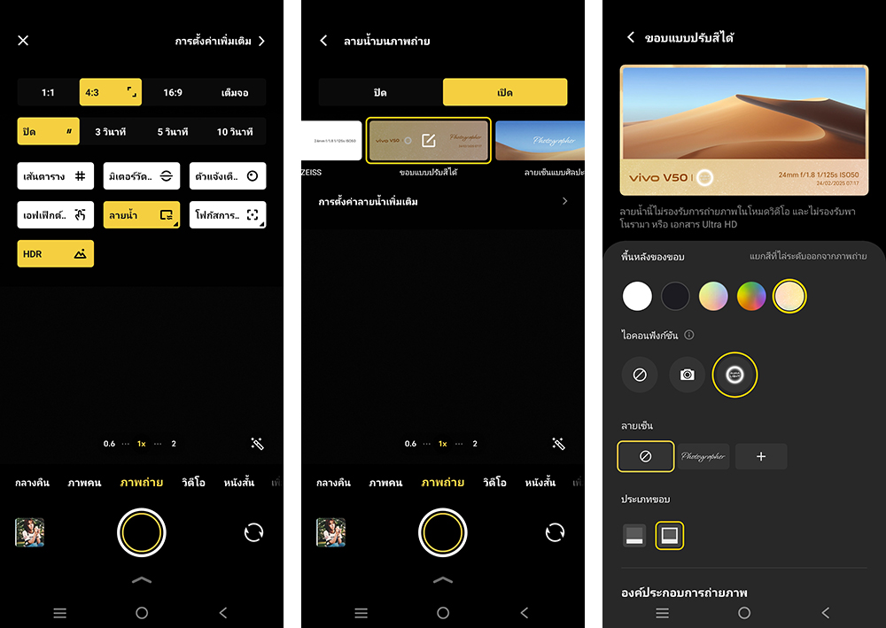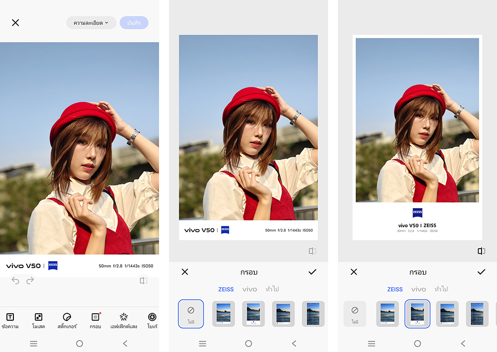 นอกจากนี้ vivo V50 ยังสามารถเลือกปรับเปลี่ยนกรอบลายน้ำเพิ่มเติมให้เป็นรูปแบบหรือเอฟเฟกต์ต่าง ๆ หลังถ่ายได้ด้วยครับ (กดเมนูแก้ไขในหน้าภาพถ่ายที่ต้องการเปลี่ยนแล้วเลือกหัวข้อ “กรอบ”)