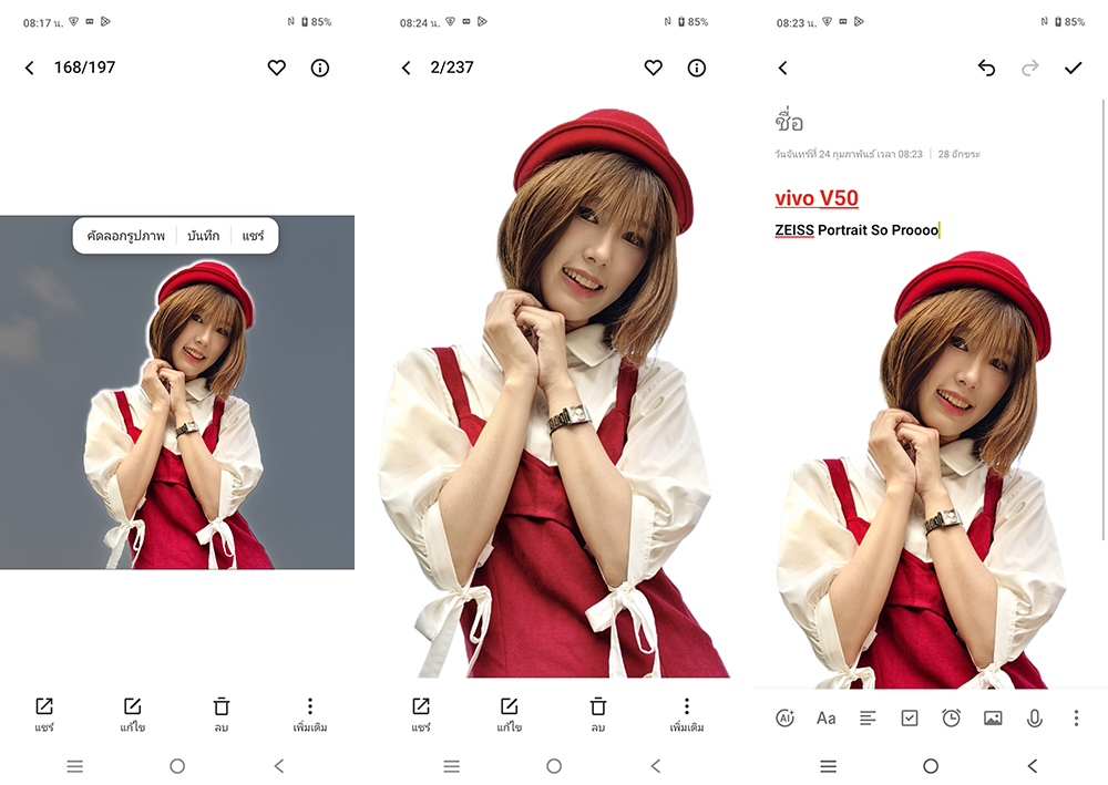 vivo V50 ยังคงมาพร้อมกับเทคโนโลยี ZEISS Portrait แบบเต็มระบบเหมือนเช่นเดิม ดังนั้นเราจึงสามารถถ่ายภาพด้วยคุณสมบัติการถ่ายภาพ “ZEISS Multifocal Portrait” หรือการถ่ายภาพพอร์ตเทรตด้วยระยะเลนส์ต่าง ๆ พร้อมกับเอฟเฟกต์ ZEISS Style Bokeh ที่เป็นเอกสิทธิ์เฉพาะของสมาร์ตโฟน vivo ได้เหมือนเดิม