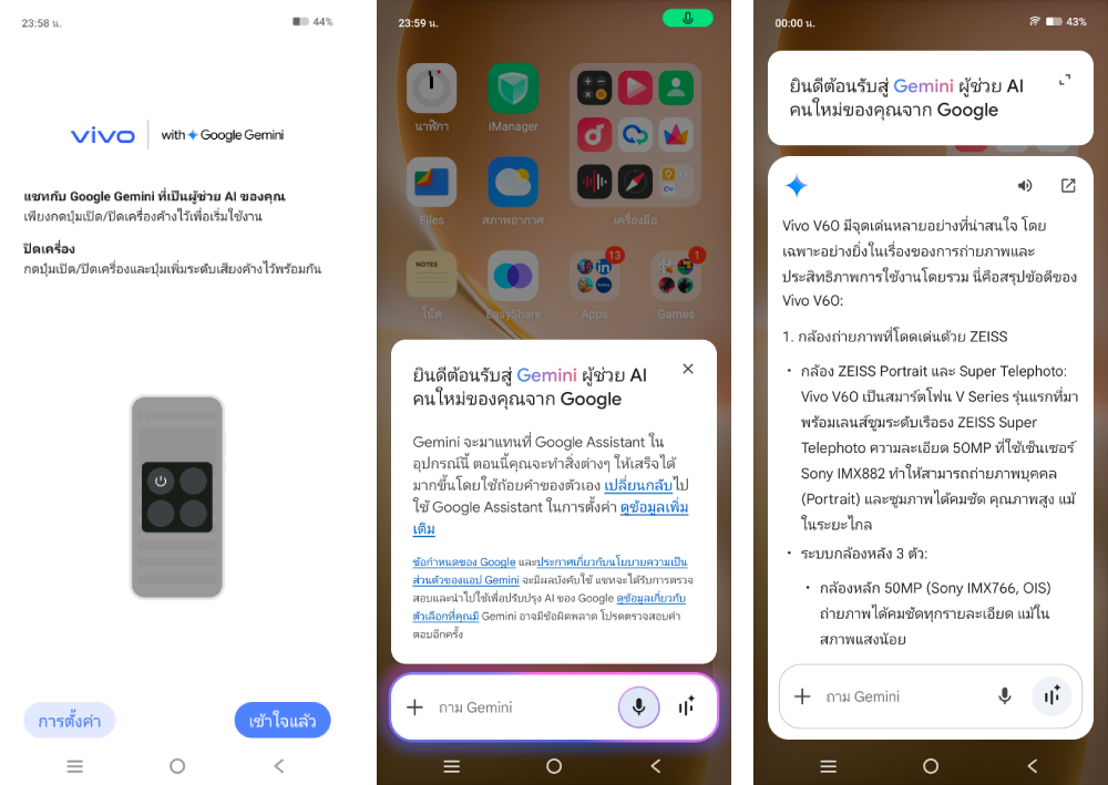 นอกจากนี้ vivo V60 ยังมากับ Gemini Assistant ผู้ช่วย AI อัจฉริยะเข้ามาช่วยทำงานด้วย เรียกได้ว่าเป็นการรวมขุมพลังการค้นหาของ Google และเทคโนโลยี Machine Learning ไว้ในที่เดียว เพียงแค่กดปุ่ม Power ด้านข้างค้างไว้ ก็พร้อมใช้ Gemini ได้ทันที