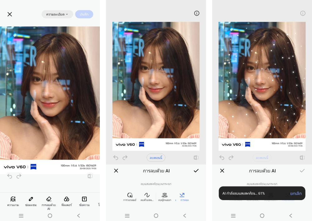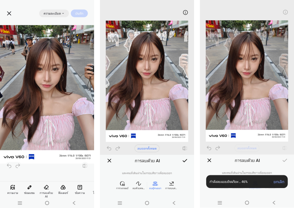 นอกจากกล้องถ่ายรูปที่เสิร์ฟช็อตภาพระดับโปรแล้ว ทางด้าน AI หลังกล้องเองก็ไม่แพ้ใคร โดย vivo V60 ใส่ความสามารถในการแก้ไข/ปรับแต่งภาพมาให้ใช้งานด้วยเช่นกัน
