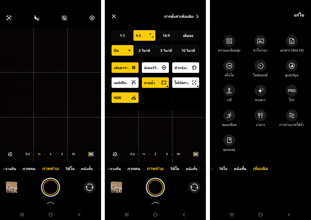 — โหมดถ่ายภาพ Night, Portrait, Photo, Video, Micro Movie, High resolution, Pano, Ultra HD Document, Slo-mo, Time-lapse, Supermoon, Astro, Pro, Snapshot, Food, Underwater Photography, Dual View, Stage, Film Camera