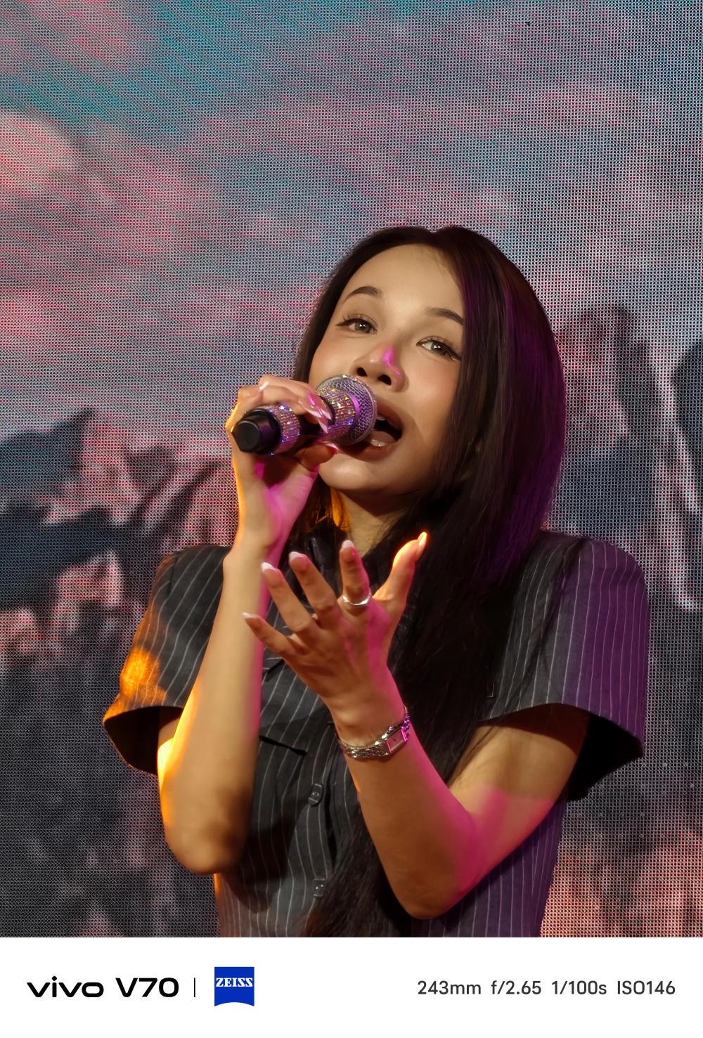นอกจากจะใช้สำหรับการถ่ายภาพนิ่งแล้ว Stage Mode ยังสามารถเปิดใช้ตอนเราบันทึกวิดีโอได้ด้วยนะครับ ซึ่งเมื่อใช้ Stage Mode ถ่ายวิดีโอในงานคอนเสิร์ต ตัวซอฟต์แวร์จะเน้นการใช้ประสิทธิภาพของไมโครโฟน 3 ตําแหน่งรอบตัวเครื่องในการเก็บเสียง ซูมเสียงบนเวทีเป็นพิเศษกว่าในโหมดถ่ายวิดีโอปกติ พร้อมกับการเร่งประสิทธิภาพของชิปเซ็ตและหน่วยความจําความเร็วสูง ทําให้ vivo V70 สามารถใช้งานโหมดเวที ถ่ายวิดีโอ 4K ได้เช่นเดียวกับในรุ่นเรือธง โดยสามารถถ่ายวิดีโอในโหมดนี้ด้วยความละเอียดสูงสุด 4K 30 FPS