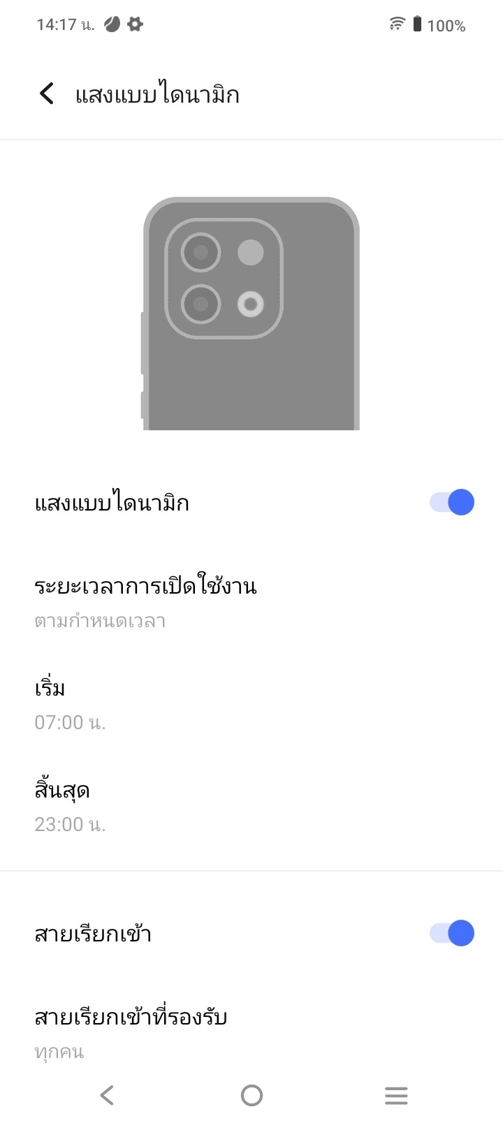 เป็นฟีเจอร์ที่ส่วนตัวผมชอบมาก ๆ เพราะบ่อยครั้งที่ทำงานเพลิน ๆ และปิดเสียงเรียกเข้าอยู่ มักจะไม่ทราบเลยว่ามีคนโทรเข้าหรือข้อความ LINE มา การมีไฟ Dynamic Light เข้ามาทำให้เราแก้ปัญหานี้ได้เลย นอกจากนี้เรายังสามารถตั้งค่าการใช้งานเพิ่มเติมจากเมนูได้ด้วย เช่น ตั้งเวลาการใช้งานเพื่อไม่ให้รบกวนตอนนอน หรือเลือกแอปฯ ที่จะให้แจ้งเตือน เป็นต้น
