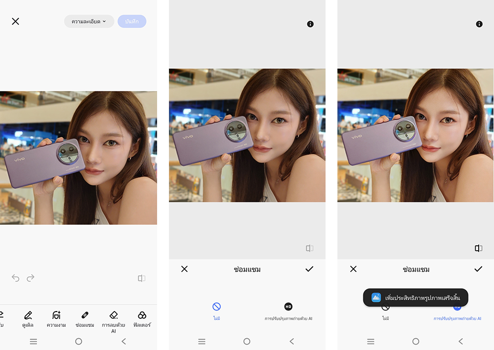ในขณะที่โหมดถ่ายภาพบนตัวเครื่องจะเป็นโหมดถ่ายภาพมาตรฐานทั้งหมด เช่น Night, Portrait, Video หรือ โหมดถ่ายภาพความละเอียดสูง 50MP เป็นต้นครับ แต่ที่พิเศษคือ ทาง vivo ใส่คุณสมบัติ AI ในการแก้ไขภาพหลังถ่ายมาให้ด้วยสองอย่าง คือ AI Erase และ AI Enhance