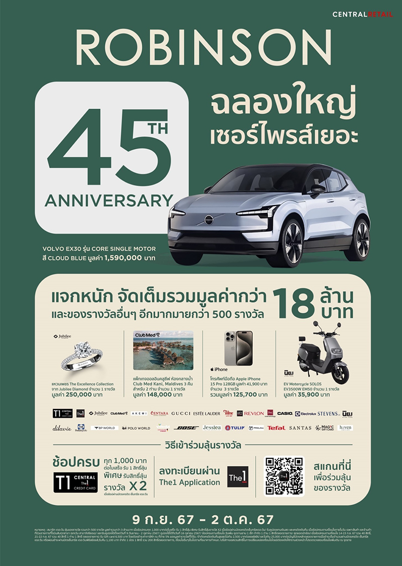 มาร่วมฉลองใหญ่ครบรอบ 45 ปีของห้างโรบินสันกับแคมเปญ “ROBINSON 45th ANNIVERSARY ฉลองใหญ่ เซอร์ไพรส์เยอะ” ตั้งแต่วันที่ 9 ก.ย. – 2 ต.ค. 67 ที่ห้างโรบินสันทุกสาขา รวมทั้งทุกช่องทางการช้อปปิ้งสุดสะดวกของห้างฯ ไม่ว่าจะเป็น ROBINSON CHAT & SHOP, ROBINSON PERSONAL SHOPPER ON DEMAND โทร.1425 ผู้ช่วยส่วนตัวสำหรับทุกคน CENTRAL APP และเว็บไซต์ WWW.CENTRAL.CO.TH ตลอด 24 ชั่วโมง รวมทั้ง FACEBOOK FANPAGE: ROBINSON DEPARTMENT STORE