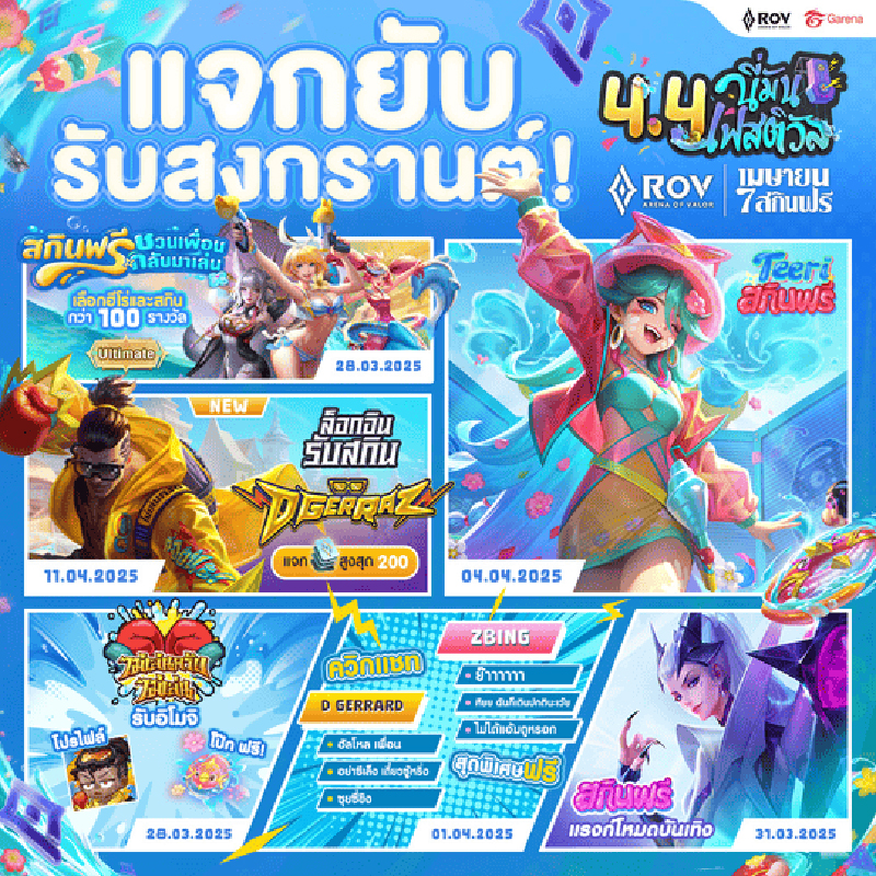 RoV เปิดตัวแคมเปญสงกรานต์ 2568 ยกทัพกิจกรรมพิเศษมามอบความสนุกให้กับเหล่าเกมเมอร์และแฟน RoV แบบฉ่ำ ๆ ทั้งการเปิดตัวสกินใหม่สุดเอ็กซ์คลูซีฟในธีมสงกรานต์ กิจกรรมแจกสกินฟรีและคูปองในเกม RoV ตลอดเดือนเมษายน และการจับมือกับ Plan B เพื่อจัด ‘คอนเสิร์ต Arena of ThaiRhythm’ ระหว่างวันที่ 12 – 14 เมษายน 2568 ณ CentralWorld นำศิลปินสุดฮอตมากมายมาระเบิดความมันส์ ให้สงกรานต์ปีนี้เดือดกว่าที่เคย!