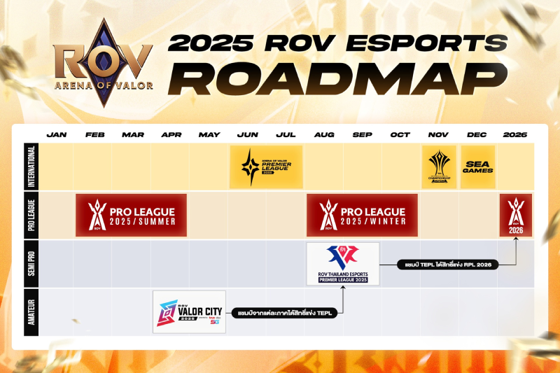 พร้อมกันนี้ การแข่งขันระดับมืออาชีพระดับประเทศอย่าง RoV Pro League (RPL) ยังคงเดินหน้าปะทุความมันส์อย่างต่อเนื่อง ด้วยการแข่งขันถึงสองฤดูกาล ได้แก่ RoV Pro League (RPL) 2025/Summer และ RoV Pro League (RPL) 2025/Winter