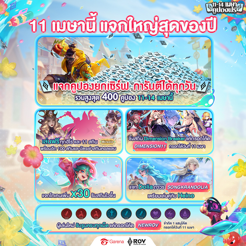 ตั้งแต่วันที่ 11 – 14 เมษายน 2568 เตรียมพบกับกิจกรรมสุดพิเศษต้อนรับเทศกาลสงกรานต์ภายในเกม RoV “คูปองฟรีทั้งเซิร์ฟ การันตีได้คูปองทุกวัน!” ที่ผู้เล่นมีสิทธิ์รับคูปองฟรีทุกวันตลอดระยะเวลากิจกรรม ไม่ว่าจะเป็นสายเปย์หรือสายฟรีก็มีสิทธิ์ลุ้นรับรางวัลแบบจัดเต็ม พิเศษ! พบกับการเปิดตัวสกินใหม่ธีมสงกรานต์ ที่จะมาสร้างสีสันให้สมรภูมิ RoV ได้แก่ Raz x D Gerrard – “เทพบุตรสายแดนซ์สงกรานต์” และ Teeri x Zbing z. – “นางฟ้าสาดน้ำสุดคิวต์”