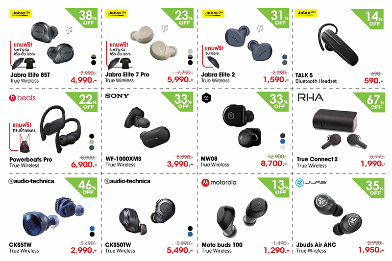 - หูฟัง Jabra รุ่น Elite 85T ราคาปกติ 7,990 บาท ราคาพิเศษ 4,990 บาท แถมฟรีร่มหรือเสื้อ Jabra