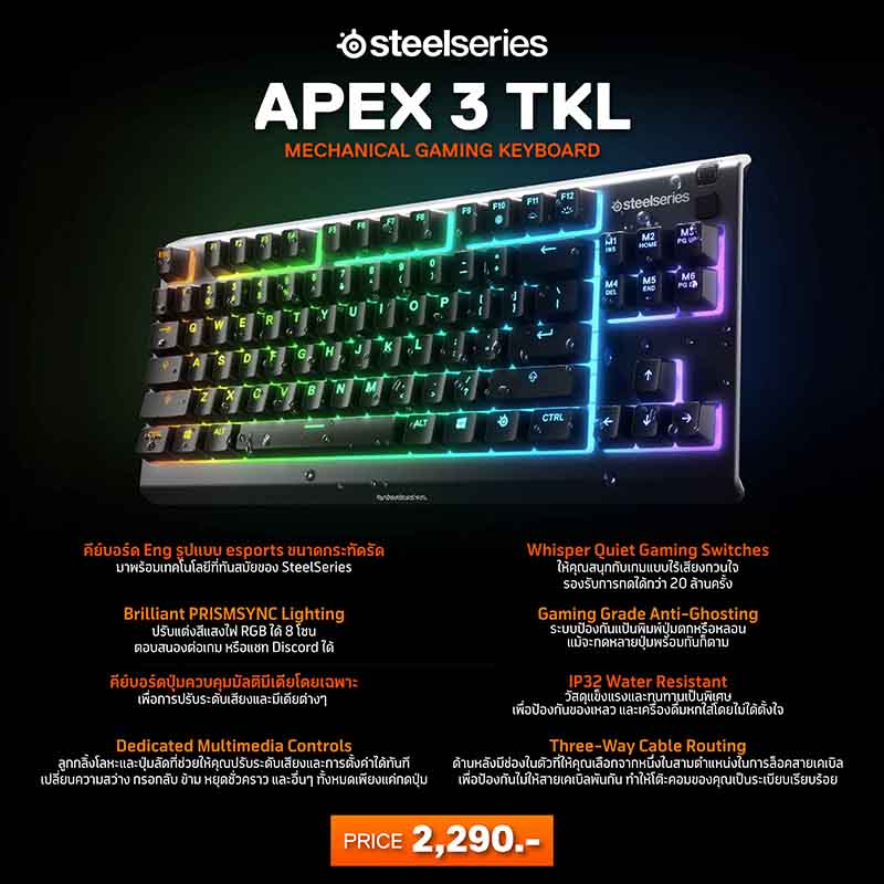 ทั้งนี้ยังช่วยให้คุณปรับความสว่าง กรอกลับ ข้าม หรือหยุดชั่วคราวด้วยการกดปุ่มเพียงปุ่มเดียว ยิ่งไปกว่านั้นโครงสร้างบริเวณด้านหลังคีย์บอร์ดจะมี 3 ช่อง ในการสำหรับ ล็อคสายเคเบิลในรูปแบบต่างๆ เพื่อเก็บสายบนโต๊ะได้อย่างสวยงามเรียบร้อย พร้อมเนรมิตโต๊ะคอมของคุณให้เป็นระเบียบเรียบร้อย อีกทั้งยังมาพร้อมระบบป้องกันแป้นพิมพ์ปุ่มตกหล่นแม้จะกดหลายปุ่มพร้อมกันก็ตาม ขณะเดียวกันปุ่มกดคีย์บอร์ดยังได้รับการออกแบบมาเป็นอย่างดีโดยผลิตจากวัสดุที่แข็งแรงและทนทานเป็นพิเศษ ยังมาพร้อมมาตรฐานกันน้ำกันฝุ่นได้ระดับ IP32 ป้องกันความเสียหายจากของเหลวและเครื่องดื่มหกใส่โดยไม่ได้ตั้งใจอีกด้วย โดย APEX 3 TKL วางจำหน่ายในราคา 2,290 บาท