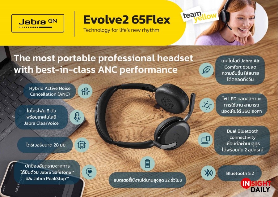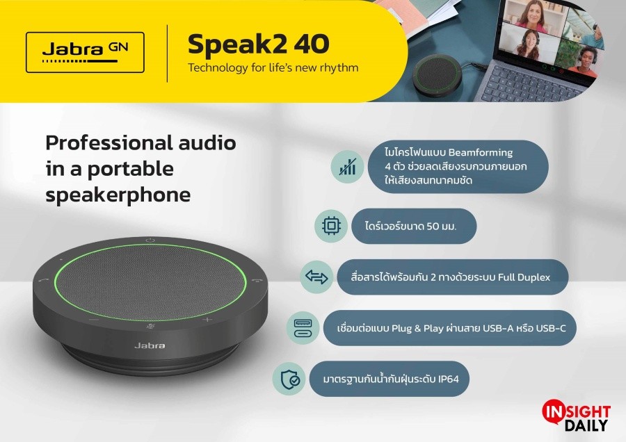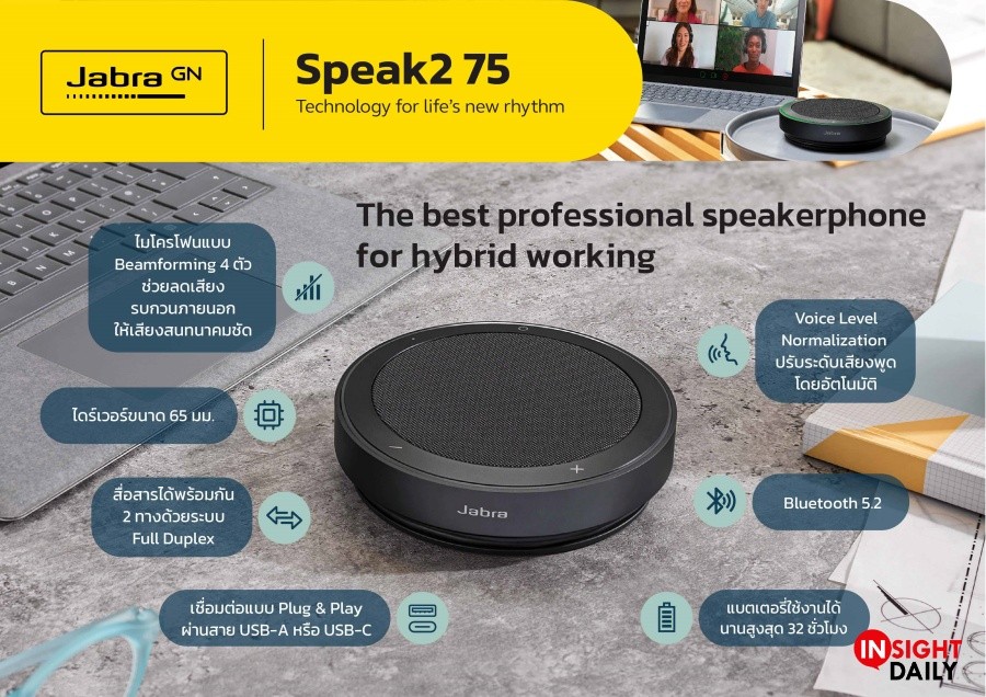 ซึ่งประกอบไปด้วยลำโพงรุ่น Speak2 40, Speak2 55 และ Speak2 75 ที่มาพร้อมคุณภาพเสียงที่คมชัด และดีไซน์กะทัดรัด เหมาะสำหรับการ Work from Anywhere หรือการประชุมกลุ่มเล็ก ควงคู่มากับหูฟังไร้สายรุ่นใหม่ล่าสุดอย่าง “Jabra Evolve2 65 Flex” ที่สามารถตัดเสียงรบกวนได้อย่างยอดเยี่ยม ตอบโจทย์คนทำงานในยุค Hybrid Working ที่ต้องการอุปกรณ์ที่ทันสมัย มีประสิทธิภาพ เพื่อให้ทำงานได้จากทุกที่