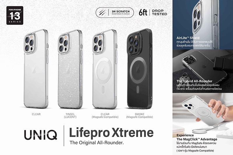 ในส่วนของ Uniq เคส iPhone 13 รุ่น LIFEPRO XTREME, รุ่น LIFEPRO XTREME TINSEL และ รุ่น LIFEPRO XTREME (Magsafe Compatible) ทั้ง 3 รุ่นนี้เป็นเคสใสกันกระแทกแบบบางเบา ให้การปกป้องขั้นขีดสุดด้วยมุมรับแรงกระแทกผลิตจากวัสดุ TPU โดยตัวเคสด้านหลังผลิตจากวัสดุ PC แบบแข็งมาตรฐานป้องกันรอยขีดข่วนระดับ 3H ผสานการปกป้อง iPhone รอบด้านด้วยเทคโนโลยี AirLite™ ที่ทุกมุมด้านใน ได้รับการออกแบบให้ช่วยดูดซับแรงกระแทกได้มากขึ้น ขณะที่ตัวเคสผ่านการทดสอบว่าสามารถรองรับแรงกระแทกจากการตกจากที่สูงได้ถึง 2 เมตร ยิ่งไปกว่านั้นเพิ่มความปลอดภัยให้เลนส์ด้วยขอบรอบเลนส์ยกสูง ป้องกันรอยขีดข่วนและกันกระแทก สำหรับในรุ่น LIFEPRO XTREME TINSEL ตัวเคสผสม 3D Glitter ลงในเนื้อเคสทำให้ทนต่อการซีดจางและให้ความแวววาวระดับพรีเมียม อีกทั้งในรุ่น LIFEPRO XTREME (Magsafe Compatible) ยังมาพร้อม MagClick™ ที่ยึดติดอย่างแน่นหนา สำหรับใช้งานร่วมกับ MagSafe ด้วยวงแหวนแม่เหล็กในตัว โดย Uniq เคส iPhone 13 Series รุ่น LIFEPRO XTREME มี 1 สี คือ สี CRYSTAL (Clear) วางจำหน่ายในราคา 690 บาท, รุ่น LIFEPRO XTREME TINSEL มี 1 สี คือ สี Lucent วางจำหน่ายในราคา 790 บาท และ รุ่น LIFEPRO XTREME (Magsafe Compatible) มีให้เลือก 2 สี ได้แก่ สี Clear และ สี Smoke วางจำหน่ายในราคา 890 บาท