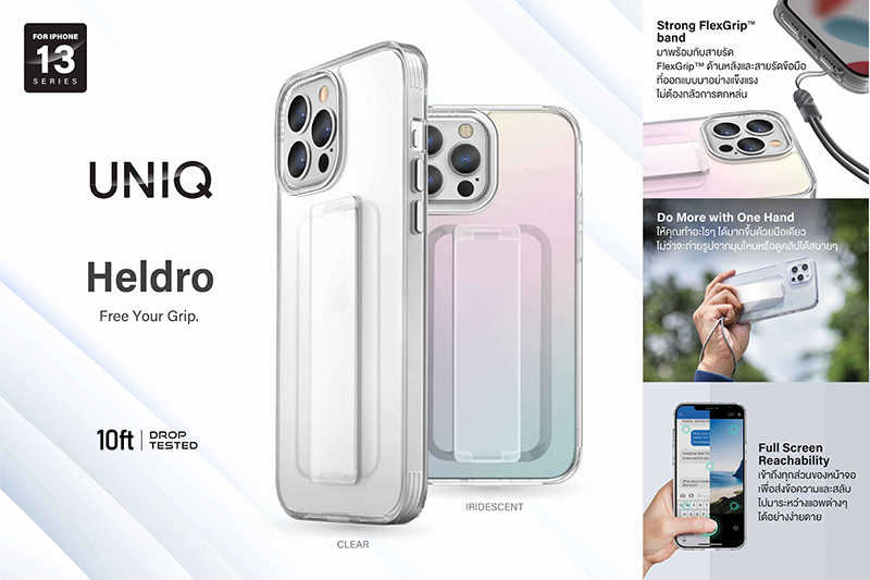 ในขณะที่ Uniq เคส iPhone 13 รุ่น HELDRO เป็นเคสใสกันกระแทก มาพร้อมกับสายรัด FlexGrip™ ด้านหลัง เพื่อให้สามารถใช้งาน iPhone ด้วยมือเดียวได้อย่างคล่องตัว และยังมาพร้อมสายคล้องข้อมือที่ออกแบบมาอย่างแข็งแรงเพื่อความปลอดภัยสูงสุด ไม่ต้องกลัวการตกหล่น ให้คุณทำอะไรๆ ได้มากขึ้นด้วยมือเดียว ไม่ว่าจะถ่ายรูปจากมุมไหนหรือเข้าถึงทุกส่วนของหน้าจอ เพื่อส่งข้อความและสลับไปมาระหว่างแอพต่างๆ ได้อย่างง่ายดาย ตัวเคสใสด้านหลังแบบแข็งผลิตจากวัสดุ PC ทนต่อการกระแทกและรอยขีดข่วน เสริมการปกป้องรอบด้านด้วยขอบกันกระแทกผลิตจากวัสดุ TPU และด้านในทุกมุมเสริมตัวช่วยดูดซับแรงกระแทกขั้นสุด อีกทั้งตัวเคสผ่านการทดสอบว่าสามารถรองรับแรงกระแทกจากการตกจากที่สูงได้ถึง 10 ฟุตเลยทีเดียว เพิ่มความปลอดภัยให้เลนส์ด้วยขอบรอบเลนส์ยกสูง ป้องกันรอยขีดข่วนและกันกระแทก โดย Uniq เคส iPhone 13 Series รุ่น HELDRO มีให้เลือก 2 สี ได้แก่ สี Clear และ สี Iridescent วางจำหน่ายในราคา 990 บาท