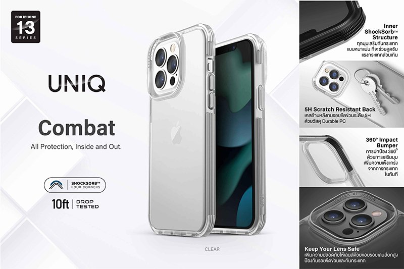 นอกจากนี้ Uniq เคส iPhone 13 รุ่น COMBAT เป็นเคสที่ออกแบบมาด้วยโครงสร้างที่แข็งแรง สามารถรองรับแรงกระแทกอย่างทรหดด้วยเทคโนโลยีการปกป้องถึง 3 ชั้น การปกป้องรอบด้าน 360° ด้วยการเสริมมุมเพิ่มความแข็งแกร่งจากการกระแทกในทันที ผสานการปกป้องด้วยกันชนกันกระแทกแบบหนาแน่น ShockSorb™ ที่มีอยู่ในบริเวณด้านข้างของเคสและที่มุมทั้ง 4 มุม ที่จะช่วยดูดซับแรงกระแทกส่วนเกินจากการตกกระแทก เคสด้านหลังทนรอยขีดข่วนระดับ 5H ด้วยวัสดุ Durable PC รวมถึงตัวเคสผ่านการทดสอบว่าสามารถรองรับแรงกระแทกจากการตกจากที่สูงได้ถึง 10 ฟุต และเพิ่มความปลอดภัยให้เลนส์ด้วยขอบรอบเลนส์ยกสูง ป้องกันรอยขีดข่วนและกันกระแทก ทำให้มั่นใจว่าเคสจะสามารถปกป้องไอโฟนของคุณได้ทั้งภายในและภายนอกได้ในทุกกิจกรรม โดย Uniq เคส iPhone 13 Series รุ่น COMBAT มี 1 สี คือ สี Clear วางจำหน่ายในราคา 790 บาท