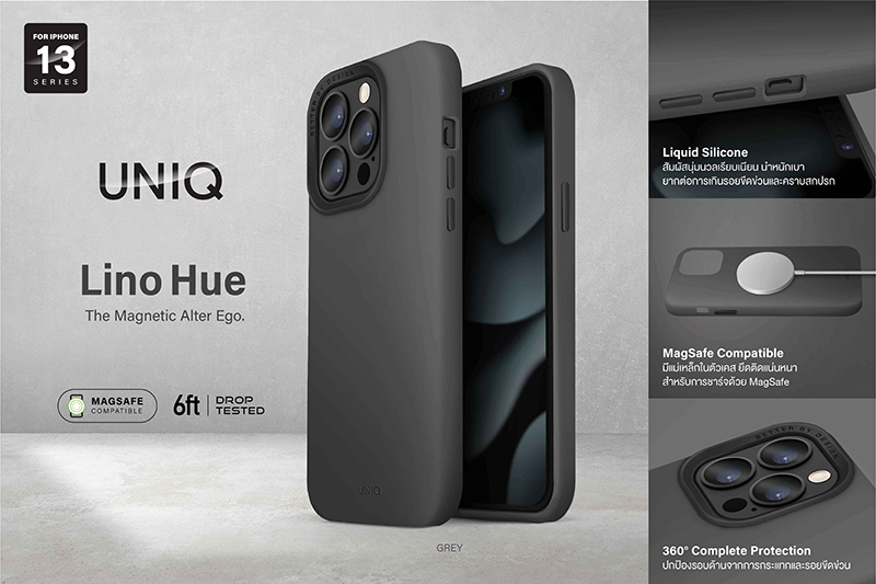 ในขณะเดียวกัน Uniq เคส iPhone 13 รุ่น LINO HUE (Magsafe Compatible) เป็นเคสที่น้ำหนักเบาเป็นพิเศษ ผลิตจากวัสดุ Liquid Silicone เกรดพรีเมียม ให้สัมผัสที่นุ่มนวลเรียบเนียน เสริมด้วยโครงสร้างการปกป้องที่แข็งแรงแบบไฮบริดถึงสองชั้น อีกทั้งยังมาพร้อมเทคโนโลยี The Latest Coating ที่ช่วยป้องกันฝุ่นและยากต่อการเกิดคราบสกปรก รวมถึงป้องกันลายนิ้วมือได้อย่างดีเยี่ยม ภายในตัวเคสด้านในซับด้วย Microfiber ให้การปกป้องไอโฟนของคุณได้สมบูรณ์แบบ 360 องศา รวมถึงตัวเคสผ่านการทดสอบว่าสามารถรองรับแรงกระแทกจากการตกจากที่สูงได้ถึง 6 ฟุต มีแม่เหล็กในตัวเคส ยึดติดแน่นหนา สำหรับการชาร์จด้วย MagSafe และเพิ่มความปลอดภัยให้เลนส์ด้วยขอบรอบเลนส์ยกสูง ป้องกันรอยขีดข่วนและกันกระแทก โดย Uniq เคส iPhone 13 Series รุ่น LINO HUE (Magsafe Compatible) มี 1 สี คือ สี Grey วางจำหน่ายในราคา 990 บาท