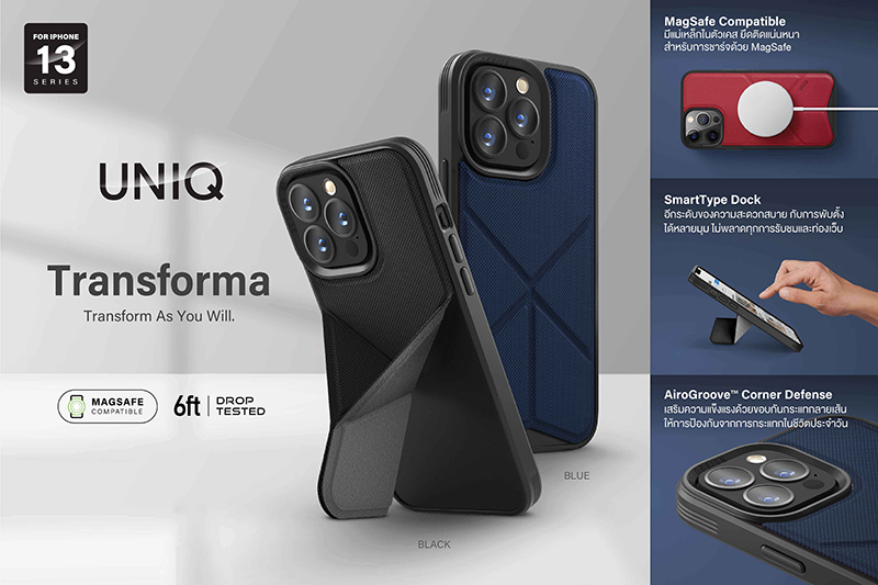 รวมถึง Uniq เคส iPhone 13 รุ่น TRANSFORMA (Magsafe Compatible) เป็นเคสแบบพับ เพื่อให้ตั้งได้ทั้งแนวตั้งและแนวนอน สะดวกในการดูคอนเทนต์ต่างๆ ผ่าน iPhone ดีไซน์เรียบง่าย ด้านหลังเคสผลิตจากวัสดุ PU คุณภาพสูงกันกระแทกและทนรอยขีดข่วน ด้านในเคสซับด้วยวัสดุ Microfiber มีแม่เหล็กในตัวเคส ยึดติดแน่นหนา สำหรับการชาร์จด้วย MagSafe ให้การปกป้อง iPhone รอบด้าน 360 องศา ด้วยขอบกันกระแทกวัสดุ TPU ผสานการปกป้องด้วยเทคโนโลยี AiroGroove™ ที่เสริมความแข็งแรงด้วยขอบกันกระแทกแบบลายเส้น ให้การป้องกันจากการกระแทกในชีวิตประจำวัน ให้คุณได้สัมผัสกับประสบการณ์ใหม่อีกระดับของความสะดวกสบาย ด้วยการพับตั้งได้หลายมุมได้ทั้งแบบแนวตั้งและแนวนอน ไม่พลาดทุกการรับชมและท่องเว็บ เพิ่มความปลอดภัยให้เลนส์ด้วยขอบรอบเลนส์ยกสูง ป้องกันรอยขีดข่วนและกันกระแทก โดย Uniq เคส iPhone 13 Series รุ่น TRANSFORMA (Magsafe Compatible) มีให้เลือก 2 สี ได้แก่ สีน้ำเงิน และ สีดำ วางจำหน่ายในราคา 890 บาท
